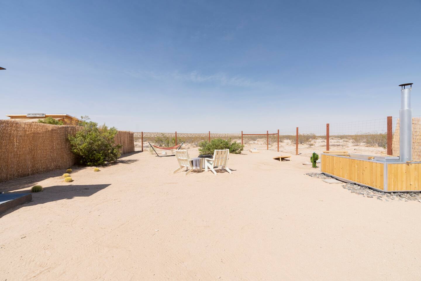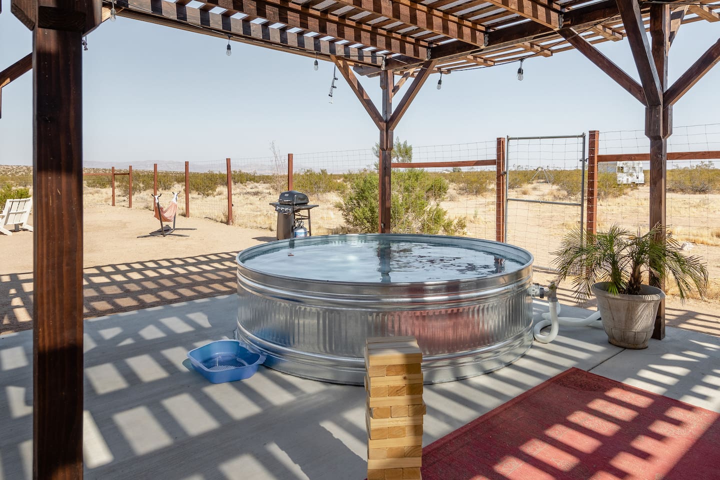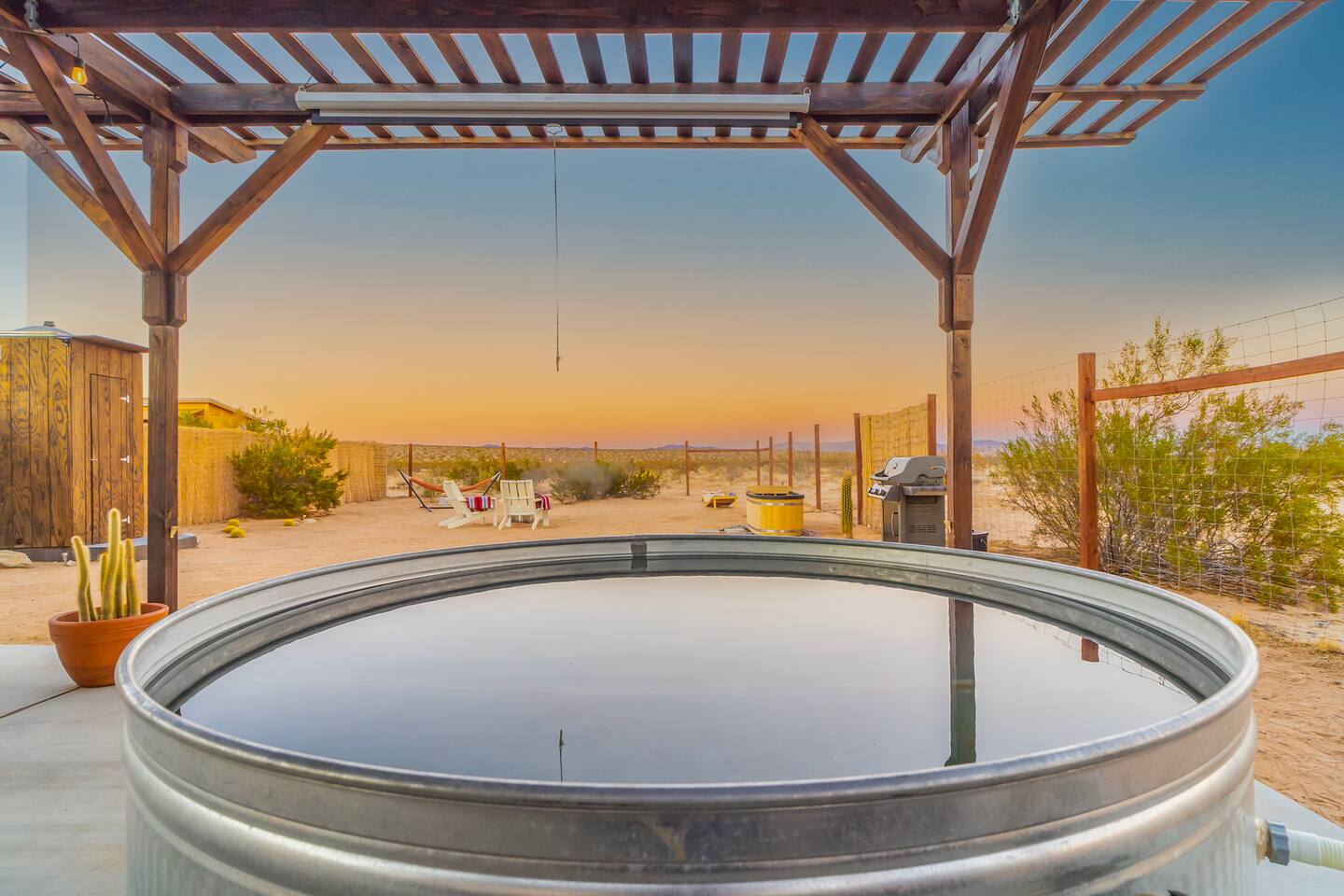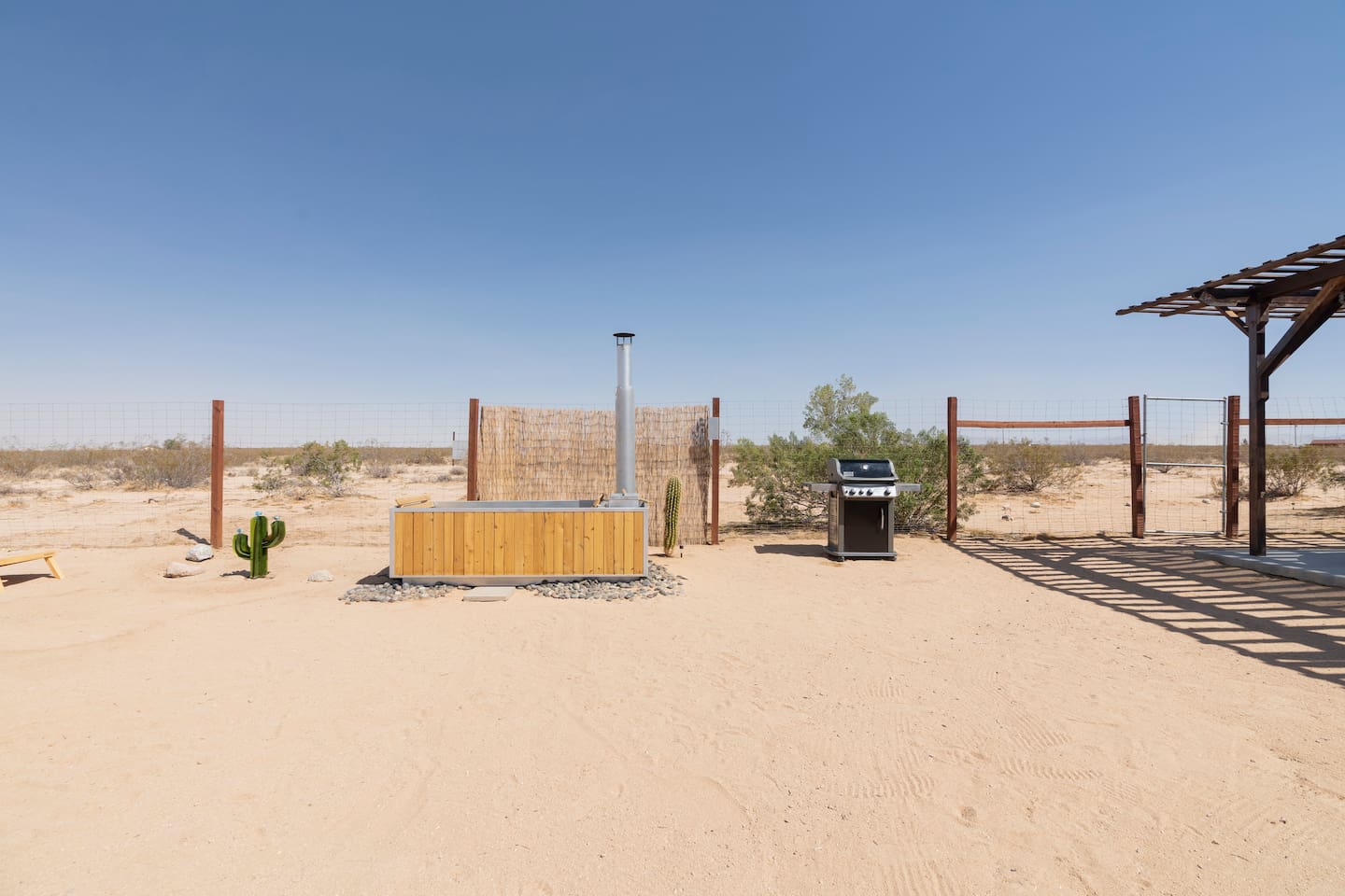 The wood-fired hot tub takes about 90–120 minutes to heat; bring your own firewood and kindling. Both the firepit and hot tub must not be used if the wind is above 10 mph (county rule). Roads are sandy; most cars are fine, but very low vehicles or large vans may have difficulty. House on the property: We live next door on the property. You might see us in the driveway (we'll say hello if so!) or hear us in our yard, but we’re quiet and keep to ourselves. The yards are separated by a fence with privacy panels. There is a military base in 29 Palms, on a very rare occasion we can hear training. Check-in: 3 PM Check-out: 11 AM Pet friendly (2 dogs max). No dogs on furniture or left unattended. Smoking outdoors only. Wildlife: You may spot coyotes, jackrabbits, roadrunners, lizards, and other desert creatures. The desert is peaceful but alive with nature, keep doors closed and food sealed, and enjoy the quiet rhythm of this wild landscape.