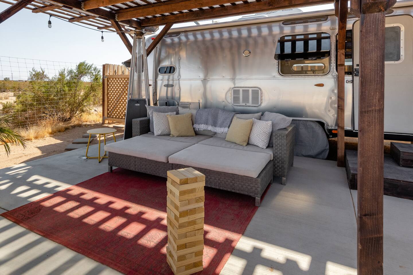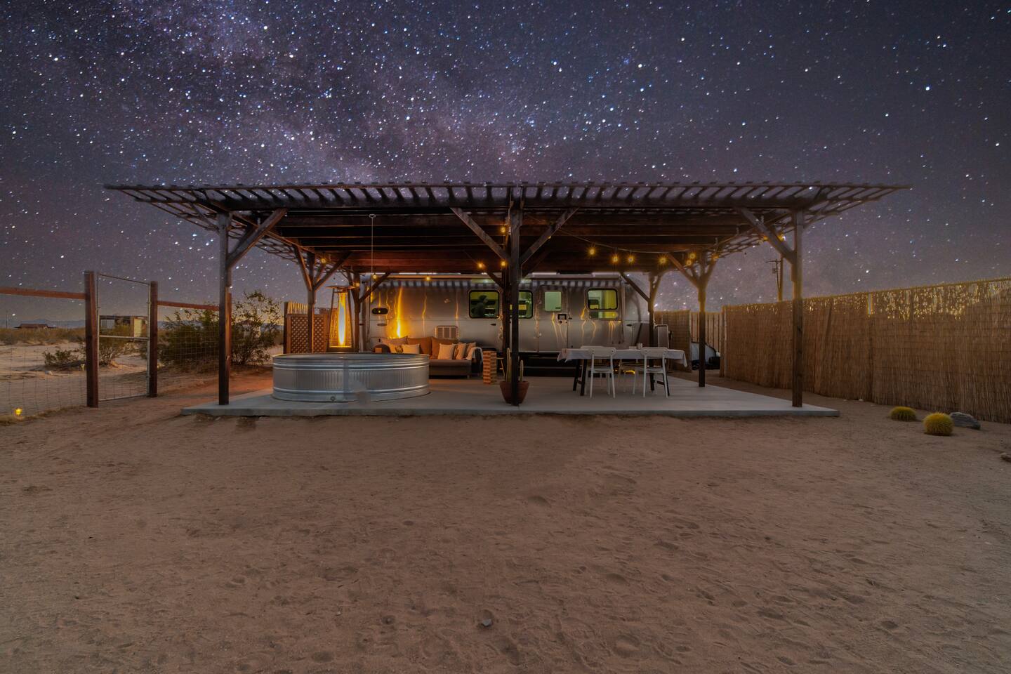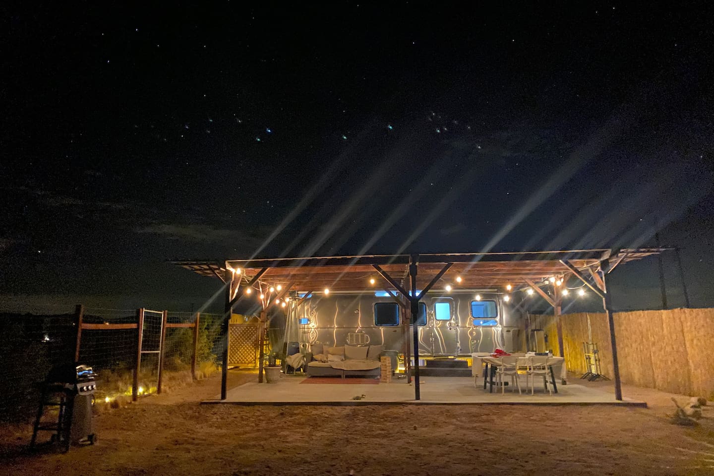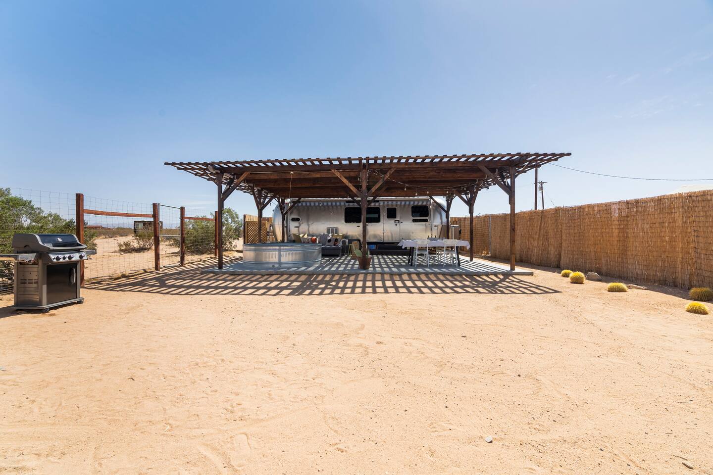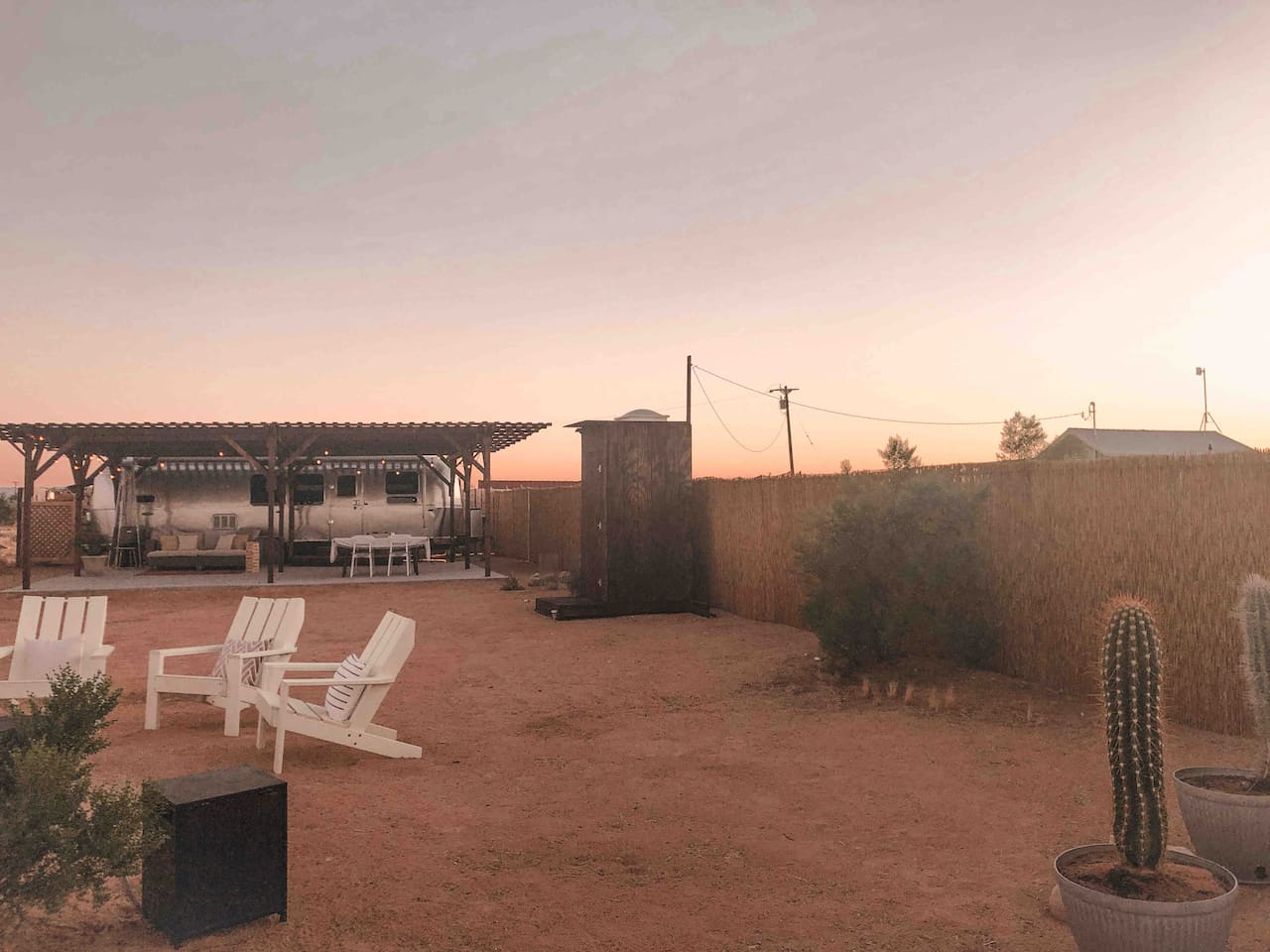 Perfect for up to two people, our 2016 Flying Cloud Airstream sits on five acres in a fenced, private yard, next to a large patio with a pergola. COMFORT: Inside, the Airstream is equipped with two air conditioners to keep you cool in the spring/summer. In the fall/winter, the Airstream is heated with a furnace and stays very comfy. We also have a back up electric heat system, so you'll always stay warm. Outside, there are misters on the patio to help keep you cool when it's hot and we have an 8 ft stock tank pool. When it’s chilly, there’s a patio heater. BEDS: The Airstream has one bedroom with a queen bed and an accordion door. There is another sleeping area in the back with bunk beds. Two adults fit comfortably in the main bedroom. In the back, the bottom bunk is between a twin and a full size, the top bunk is smaller and has a weight limit of 125 lbs. There is a curtain to close off this back sleeping area. We usually don't accept more than two guests, but if you are interested in bringing your kids, please reach out to inquire. COOKING: There is a kitchen with a sink, propane stove top and a microwave. We do not have an oven. There is a propane BBQ available outside (propane is provided). There is running hot and cold water in the Airstream and a refrigerator with freezer. We provide plates, cups, silverware, pots, pans, cooking utensils, etc. There is also a coffee and tea station with a Nespresso machine, a French Press and an electric tea kettle. We provide Nespresso pods, creamer, sugar, various teas and single serve coffee that comes in a tea bag (normally we would provide ground coffee but with our added COVID safety measures in place, we're keeping everything single serve. You may want to bring your own ground coffee). WATER: The water to the Airstream is drinkable. BATHROOM/SHOWER: We have an outside shower with hot and cold water. There is also a hot/cold indoor shower. There is an outhouse with a dry toilet a few steps from the Airstream. PATIO/YARD: The large patio is fully shaded and has a dining table with chairs and an outdoor couch. There is a propane fire pit in the yard. We have giant Jenga and ladder ball for you to enjoy. POOL: We have an 8 ft stock tank pool to keep you cool in the warm weather. TECH: There is a TV with Fire Stick with Amazon Prime and Disney+ in the bedroom. We can also provide a projector for big screen moves on the patio (super fun!). We have Wifi and most cell service works here. PETS: Up to two well behaved dogs allowed. They are not allowed on any of the furniture/beds. They can be off-leash inside the fenced yard (the fence is 6 ft). ROADS/DRIVING: We are located off the pavement and the roads are a bit rough. 4WD is nice but not necessary (we have both an AWD and a 2WD), most cars have no issue getting here but it can be tricky for very low cars. COVID SAFETY: We live on the property but are fully socially distancing and will give you your space and privacy. If there is an issue and we need to come over, we will be masked and will socially distance. We are taking extra cleaning and sanitizing measures. *We are fully vaccinated, as it our cleaning team. This is not a guarantee of anything and we will continue to wear our masks but it is info we are happy to share with you.* We also request that you socially distance and wear your masks properly while in town. Let's keep everyone safe :) THANK YOU: We love hosting and it's our goal for you to have the best time out here in the desert! If you'd like to connect on IG: @adventurejoshuatree