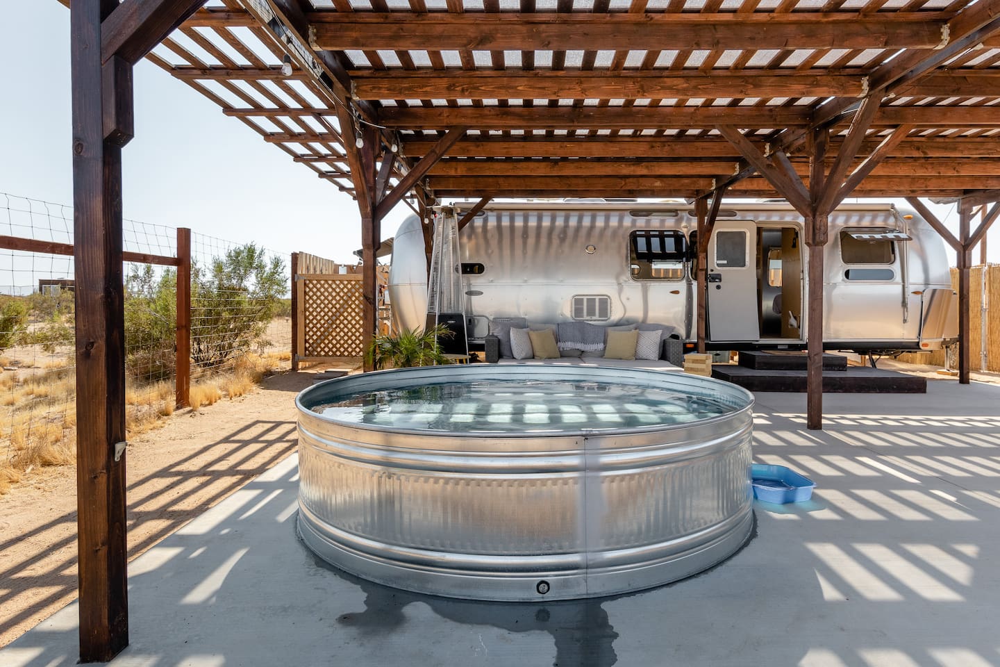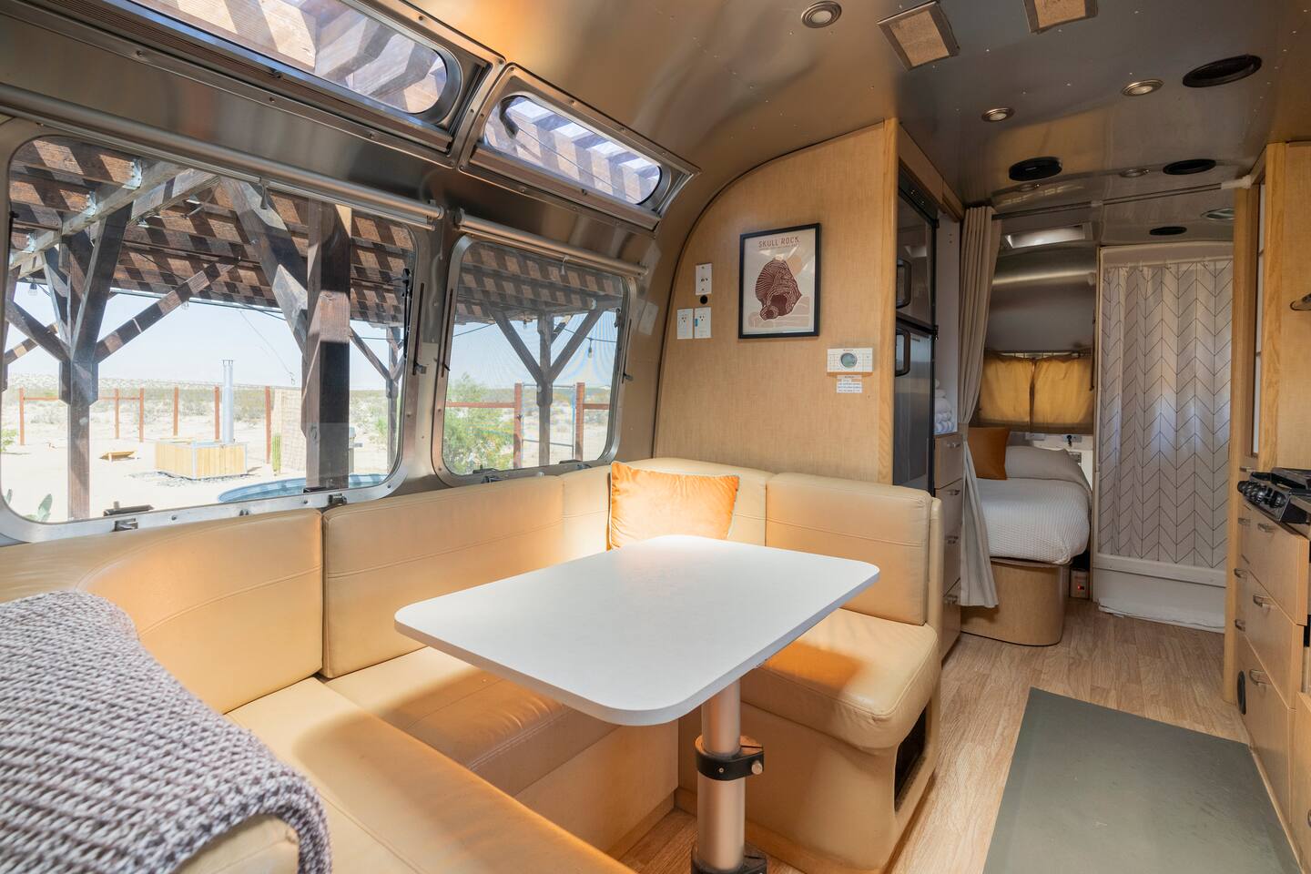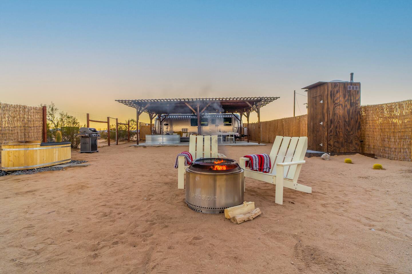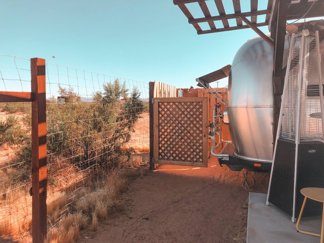Perfect for up to two people, our 2016 Flying Cloud Airstream sits on five acres in a fenced, private yard, next to a large patio with a pergola. COMFORT: Inside, the Airstream is equipped with two air conditioners to keep you cool in the spring/summer. In the fall/winter, the Airstream is heated with a furnace and stays very comfy. We also have a back up electric heat system, so you'll always stay warm. Outside, there are misters on the patio to help keep you cool when it's hot and we have an 8 ft stock tank pool. When it’s chilly, there’s a patio heater. BEDS: The Airstream has one bedroom with a queen bed and an accordion door. There is another sleeping area in the back with bunk beds. Two adults fit comfortably in the main bedroom. In the back, the bottom bunk is between a twin and a full size, the top bunk is smaller and has a weight limit of 125 lbs. There is a curtain to close off this back sleeping area. We usually don't accept more than two guests, but if you are interested in bringing your kids, please reach out to inquire. COOKING: There is a kitchen with a sink, propane stove top and a microwave. We do not have an oven. There is a propane BBQ available outside (propane is provided). There is running hot and cold water in the Airstream and a refrigerator with freezer. We provide plates, cups, silverware, pots, pans, cooking utensils, etc. There is also a coffee and tea station with a Nespresso machine, a French Press and an electric tea kettle. We provide Nespresso pods, creamer, sugar, various teas and single serve coffee that comes in a tea bag (normally we would provide ground coffee but with our added COVID safety measures in place, we're keeping everything single serve. You may want to bring your own ground coffee). WATER: The water to the Airstream is drinkable. BATHROOM/SHOWER: We have an outside shower with hot and cold water. There is also a hot/cold indoor shower. There is an outhouse with a dry toilet a few steps from the Airstream. PATIO/YARD: The large patio is fully shaded and has a dining table with chairs and an outdoor couch. There is a propane fire pit in the yard. We have giant Jenga and ladder ball for you to enjoy. POOL: We have an 8 ft stock tank pool to keep you cool in the warm weather. TECH: There is a TV with Fire Stick with Amazon Prime and Disney+ in the bedroom. We can also provide a projector for big screen moves on the patio (super fun!). We have Wifi and most cell service works here. PETS: Up to two well behaved dogs allowed. They are not allowed on any of the furniture/beds. They can be off-leash inside the fenced yard (the fence is 6 ft). ROADS/DRIVING: We are located off the pavement and the roads are a bit rough. 4WD is nice but not necessary (we have both an AWD and a 2WD), most cars have no issue getting here but it can be tricky for very low cars. COVID SAFETY: We live on the property but are fully socially distancing and will give you your space and privacy. If there is an issue and we need to come over, we will be masked and will socially distance. We are taking extra cleaning and sanitizing measures. *We are fully vaccinated, as it our cleaning team. This is not a guarantee of anything and we will continue to wear our masks but it is info we are happy to share with you.* We also request that you socially distance and wear your masks properly while in town. Let's keep everyone safe :) THANK YOU: We love hosting and it's our goal for you to have the best time out here in the desert! If you'd like to connect on IG: @adventurejoshuatree