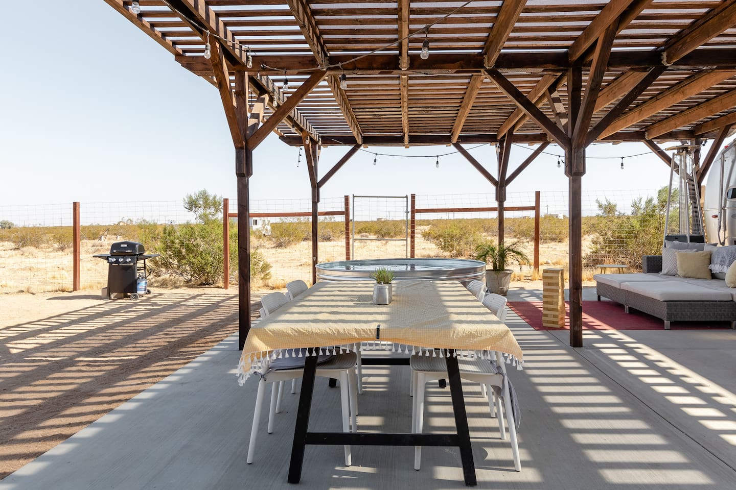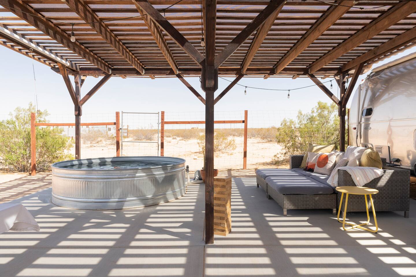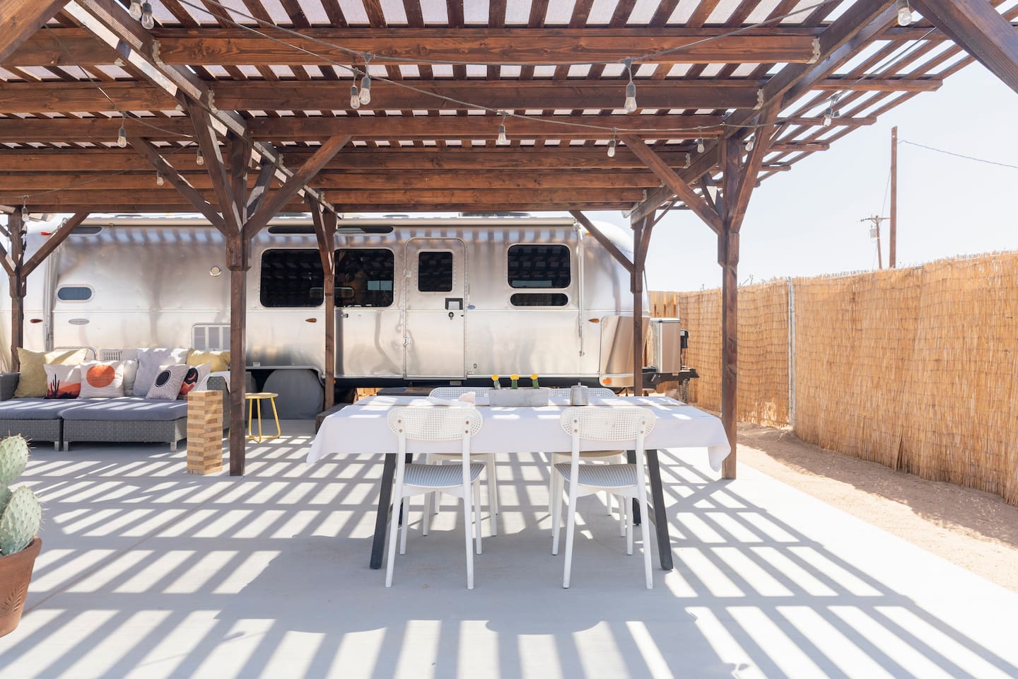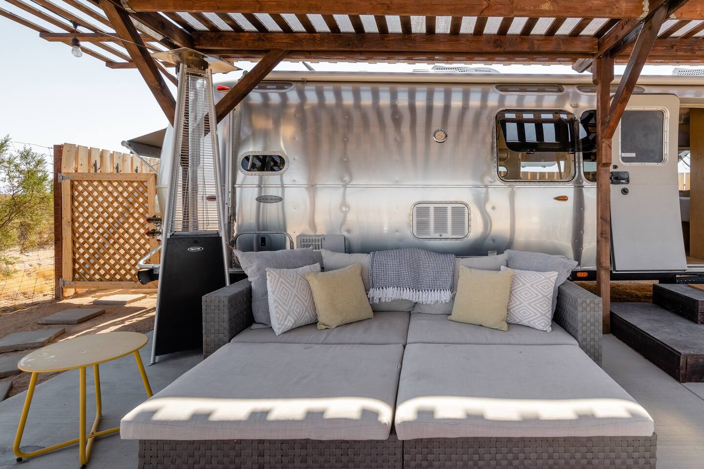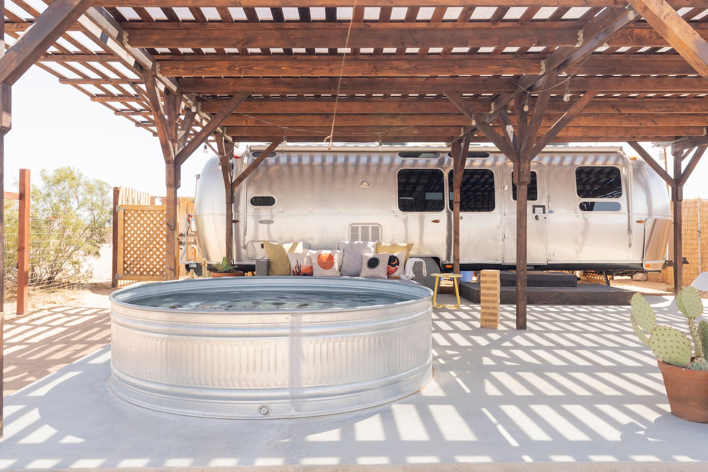 Perfect for up to two people, our 2016 Flying Cloud Airstream sits on five acres in a fenced, private yard, next to a large patio with a pergola. COMFORT: Inside, the Airstream is equipped with two air conditioners to keep you cool in the spring/summer. In the fall/winter, the Airstream is heated with a furnace and stays very comfy. We also have a back up electric heat system, so you'll always stay warm. Outside, there are misters on the patio to help keep you cool when it's hot and we have an 8 ft stock tank pool. When it’s chilly, there’s a patio heater. BEDS: The Airstream has one bedroom with a queen bed and an accordion door. There is another sleeping area in the back with bunk beds. Two adults fit comfortably in the main bedroom. In the back, the bottom bunk is between a twin and a full size, the top bunk is smaller and has a weight limit of 125 lbs. There is a curtain to close off this back sleeping area. We usually don't accept more than two guests, but if you are interested in bringing your kids, please reach out to inquire. COOKING: There is a kitchen with a sink, propane stove top and a microwave. We do not have an oven. There is a propane BBQ available outside (propane is provided). There is running hot and cold water in the Airstream and a refrigerator with freezer. We provide plates, cups, silverware, pots, pans, cooking utensils, etc. There is also a coffee and tea station with a Nespresso machine, a French Press and an electric tea kettle. We provide Nespresso pods, creamer, sugar, various teas and single serve coffee that comes in a tea bag (normally we would provide ground coffee but with our added COVID safety measures in place, we're keeping everything single serve. You may want to bring your own ground coffee). WATER: The water to the Airstream is drinkable. BATHROOM/SHOWER: We have an outside shower with hot and cold water. There is also a hot/cold indoor shower. There is an outhouse with a dry toilet a few steps from the Airstream. PATIO/YARD: The large patio is fully shaded and has a dining table with chairs and an outdoor couch. There is a propane fire pit in the yard. We have giant Jenga and ladder ball for you to enjoy. POOL: We have an 8 ft stock tank pool to keep you cool in the warm weather. TECH: There is a TV with Fire Stick with Amazon Prime and Disney+ in the bedroom. We can also provide a projector for big screen moves on the patio (super fun!). We have Wifi and most cell service works here. PETS: Up to two well behaved dogs allowed. They are not allowed on any of the furniture/beds. They can be off-leash inside the fenced yard (the fence is 6 ft). ROADS/DRIVING: We are located off the pavement and the roads are a bit rough. 4WD is nice but not necessary (we have both an AWD and a 2WD), most cars have no issue getting here but it can be tricky for very low cars. COVID SAFETY: We live on the property but are fully socially distancing and will give you your space and privacy. If there is an issue and we need to come over, we will be masked and will socially distance. We are taking extra cleaning and sanitizing measures. *We are fully vaccinated, as it our cleaning team. This is not a guarantee of anything and we will continue to wear our masks but it is info we are happy to share with you.* We also request that you socially distance and wear your masks properly while in town. Let's keep everyone safe :) THANK YOU: We love hosting and it's our goal for you to have the best time out here in the desert! If you'd like to connect on IG: @adventurejoshuatree