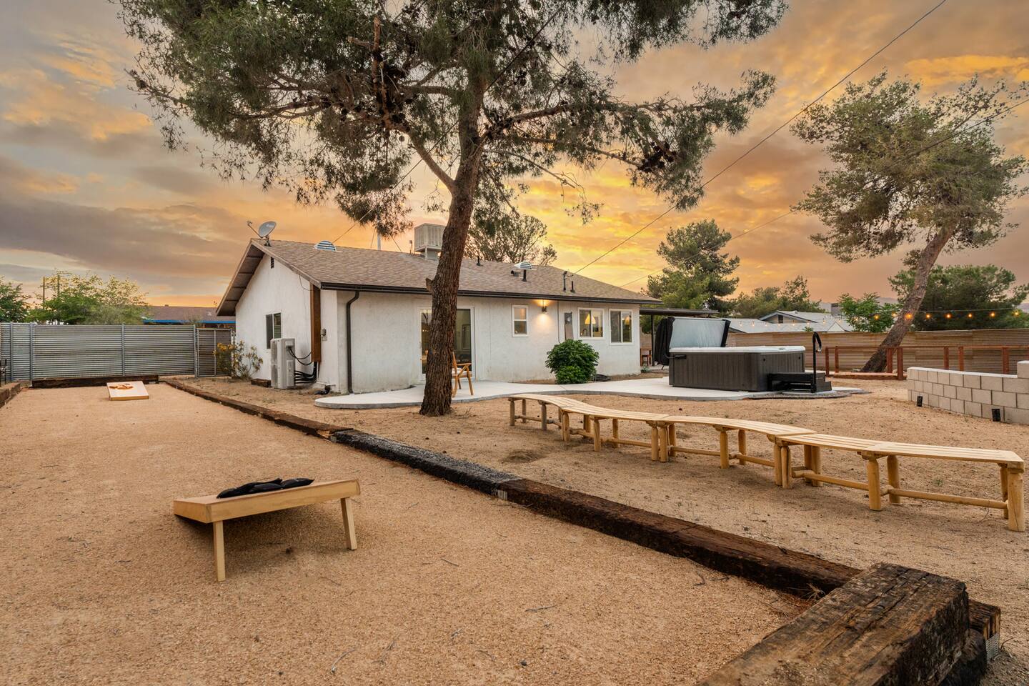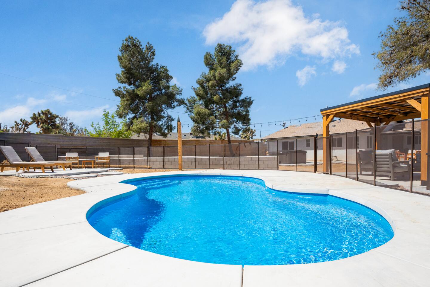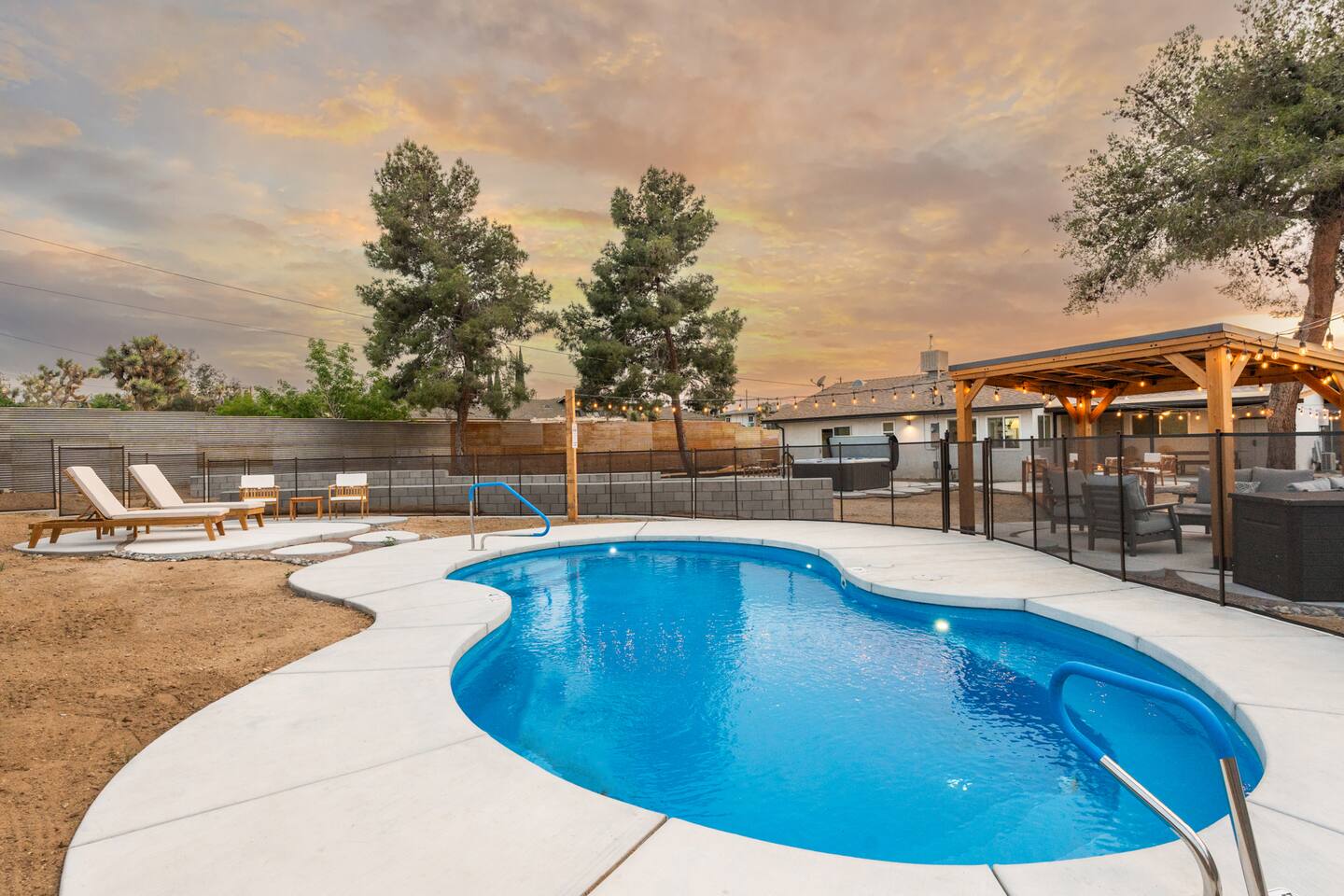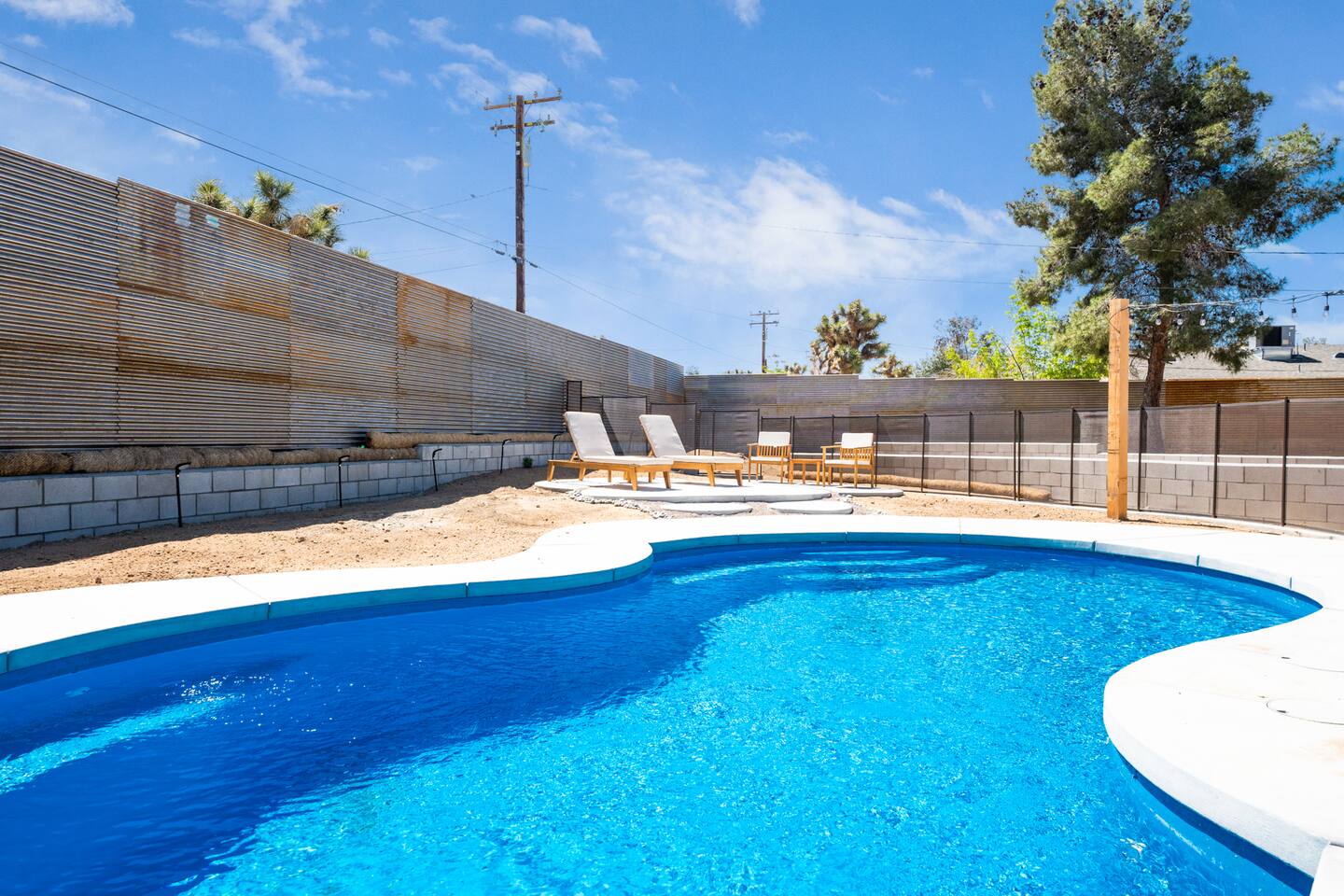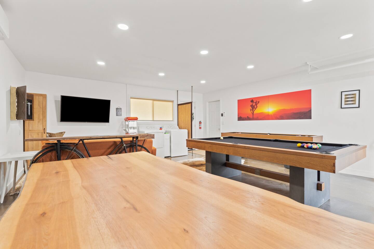 Immerse yourself in the stunning beauty of Joshua Tree National Park. This incredible area features dramatic, rugged landscapes, spectacular rock formations, and the iconic Joshua trees. Explore ancient boulder piles and rock outcroppings, take in gorgeous sunrises and sunsets, and enjoy the peaceful solitude of the desert. Joshua Tree National Park is unforgettable for all ages and a must-see for any nature enthusiast. This lovely three-bedroom house in Yucca Valley is the perfect home away from home for families or groups of up to 8. The house is ideally situated close to Joshua Tree National Park, making it easy to explore the stunning desert landscape. Inside, there’s plenty of space for everyone to relax and enjoy. Three bedrooms provide a cozy retreat for a good night’s sleep, while the in-ground pool, hot tub, game room, movie area, and fire pit ensure there’s something for everyone to do. There’s also a BBQ and cornhole for outdoor fun. You’ll be perfectly positioned to explore: 3 minutes ➔ The Copper Room 5 minutes ➔ Frontier Café & Old Town Yucca Valley 10 minutes ➔ Pappy & Harriet’s 11 minutes ➔ Joshua Tree National Park Visitor Center 12 minutes ➔ La Copine 20 minutes ➔ Integratron 40 minutes ➔ Palm Springs Bedrooms Back bedroom (primary suite): King bed, en-suite bathroom, makeup table, large closet, and TV Middle bedroom: Queen bed, closet, dresser, and TV Front bedroom: Full bed, sofa that unfolds into a full bed, closet, dresser, and TV All TVs in the house are smart TVs where you can log in to your streaming accounts. Living & Kitchen The open-plan living spaces are generously furnished with the essentials you need to make your stay comfortable. The kitchen includes: Microwave Dishwasher Coffee station Counter dining area Breakfast nook The kitchen and living areas are seamlessly combined into one room, giving guests flexibility. Cook a delicious meal while still interacting with family and friends. Game Room & Amenities There is a game room furnished with: Pool table Shuffleboard Picnic-style table Movie-watching area There is also a washer and dryer for your convenience. Highlights include: ⁕ 3 bedrooms with comfy beds plus a pull-out full sofa and twin daybeds in the living room (sleeps up to 8 guests) ⁕ Beautiful in-ground pool with patio for lounging ⁕ Spa for relaxing and stargazing at night ⁕ Large propane fire pit for gathering ⁕ Outdoor dining and seating area ⁕ Game room with pool table, shuffleboard, darts, and movie-watching area ⁕ Pet friendly – up to 2 pups welcome! ⁕ Fully equipped kitchen ⁕ Open floor plan kitchen, dining, and living area ⁕ Reliable and fast WiFi ⁕ Coffee and coffee maker ready for your morning coffee Experiences Rooted in the community, we know the desert well and enjoy sharing it with our guests. Here are some unforgettable ways to experience the area: Immerse yourself in a sound bath at the Integratron or with a local practitioner. Book an in-home massage with a trusted desert therapist. Set out on a private guided hike. Enjoy a custom meal prepared in-home by a private chef. Move and reset with a personal yoga or Pilates session. Discover the night sky on a private stargazing tour under some of California’s darkest skies. Explore canyons and creeks on a private horseback ride. Try cold plunges and wellness sessions with local experts. We’d love to connect you with our favorite local guides and practitioners.