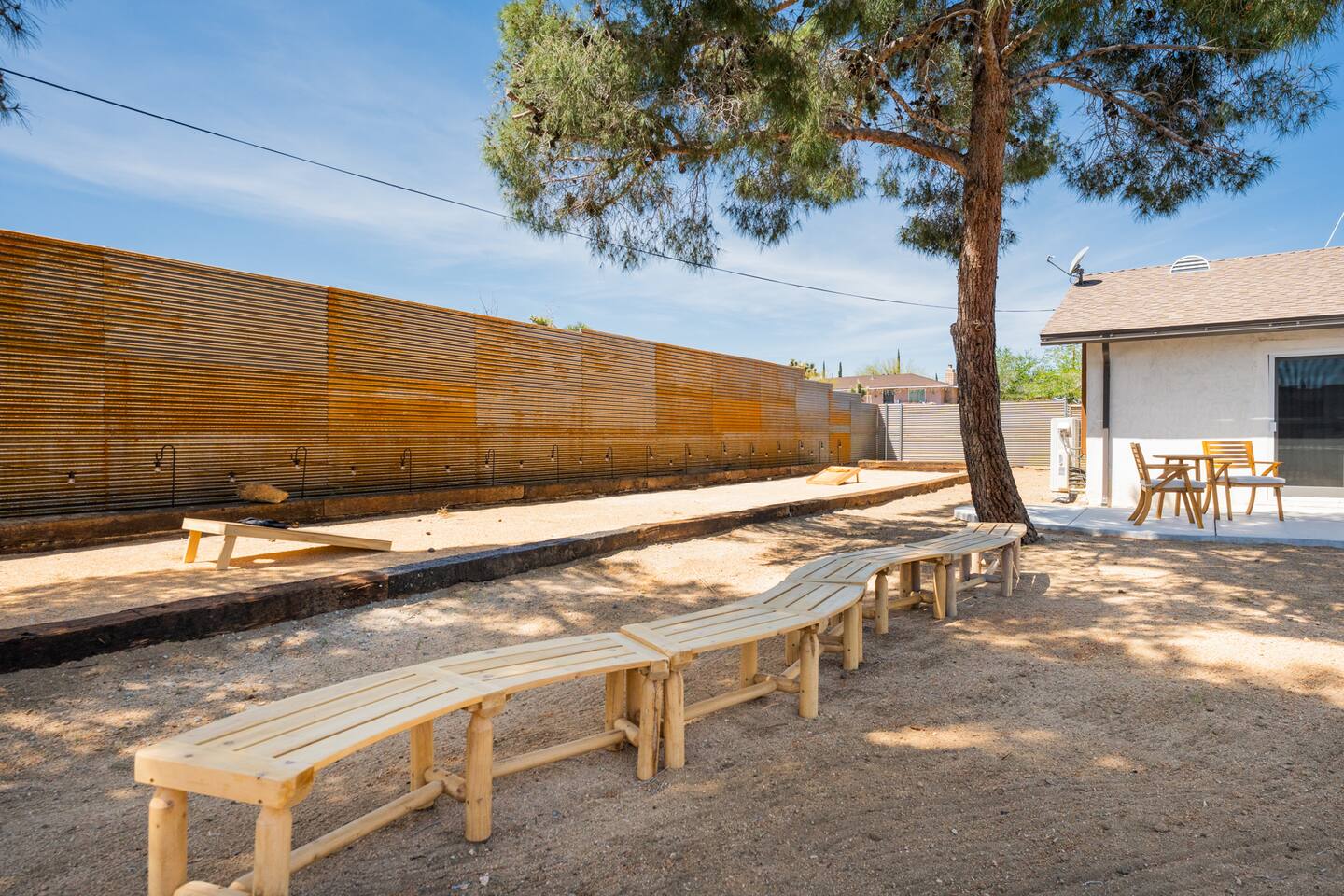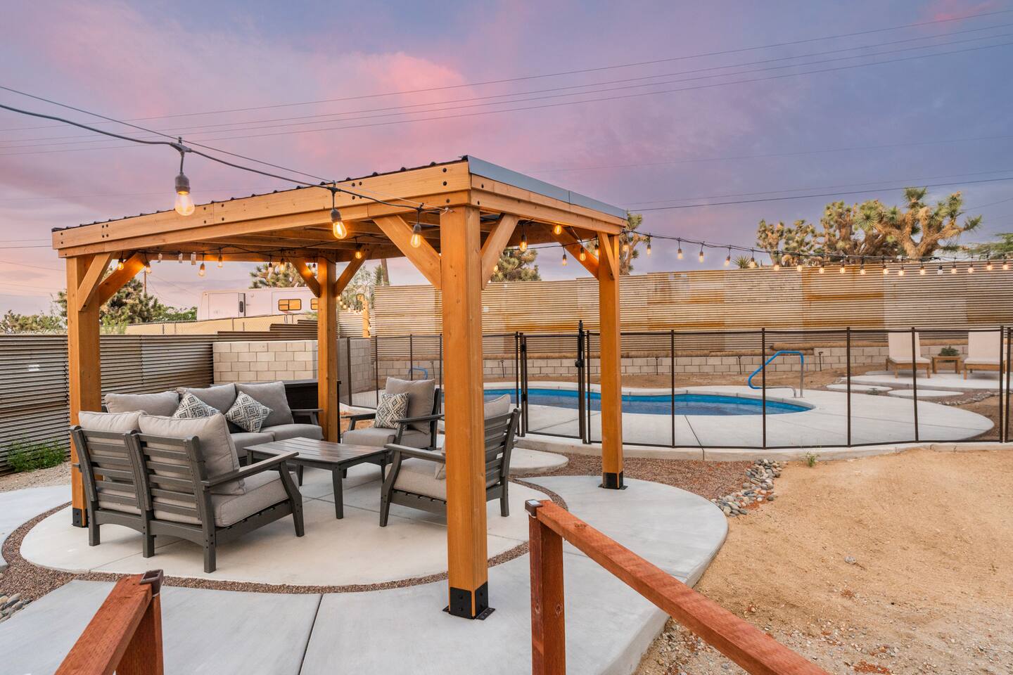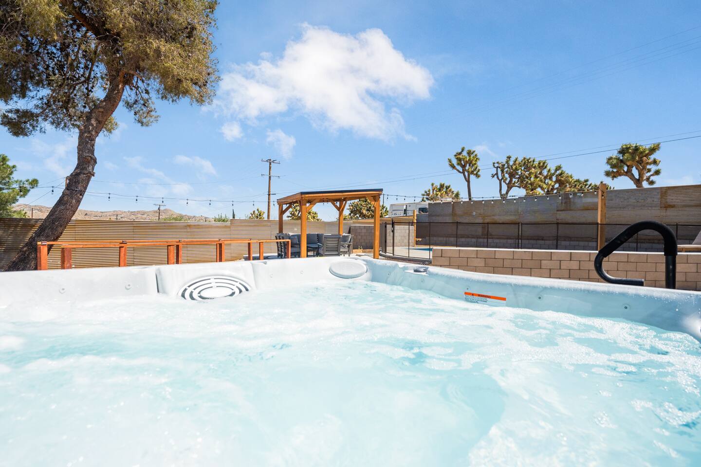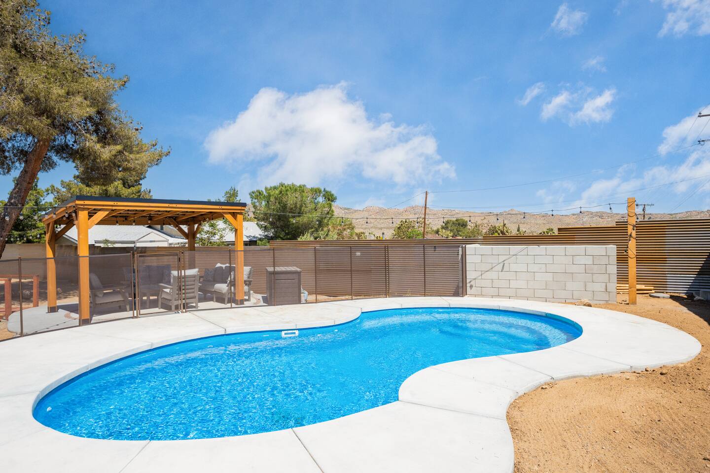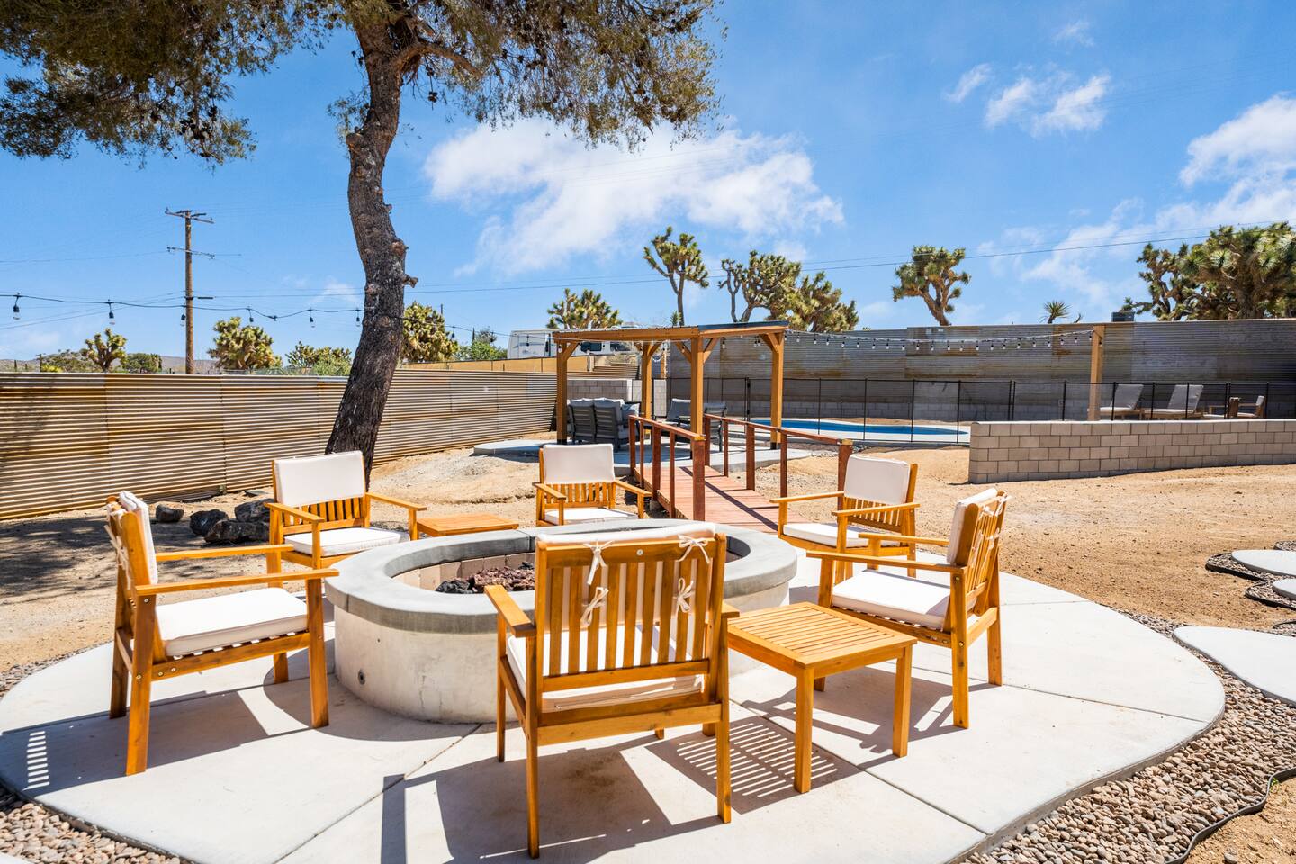 Immerse yourself in the stunning beauty of Joshua Tree National Park. This incredible area features dramatic, rugged landscapes, spectacular rock formations, and the iconic Joshua trees. Explore ancient boulder piles and rock outcroppings, take in gorgeous sunrises and sunsets, and enjoy the peaceful solitude of the desert. Joshua Tree National Park is unforgettable for all ages and a must-see for any nature enthusiast. This lovely three-bedroom house in Yucca Valley is the perfect home away from home for families or groups of up to 8. The house is ideally situated close to Joshua Tree National Park, making it easy to explore the stunning desert landscape. Inside, there’s plenty of space for everyone to relax and enjoy. Three bedrooms provide a cozy retreat for a good night’s sleep, while the in-ground pool, hot tub, game room, movie area, and fire pit ensure there’s something for everyone to do. There’s also a BBQ and cornhole for outdoor fun. You’ll be perfectly positioned to explore: 3 minutes ➔ The Copper Room 5 minutes ➔ Frontier Café & Old Town Yucca Valley 10 minutes ➔ Pappy & Harriet’s 11 minutes ➔ Joshua Tree National Park Visitor Center 12 minutes ➔ La Copine 20 minutes ➔ Integratron 40 minutes ➔ Palm Springs Bedrooms Back bedroom (primary suite): King bed, en-suite bathroom, makeup table, large closet, and TV Middle bedroom: Queen bed, closet, dresser, and TV Front bedroom: Full bed, sofa that unfolds into a full bed, closet, dresser, and TV All TVs in the house are smart TVs where you can log in to your streaming accounts. Living & Kitchen The open-plan living spaces are generously furnished with the essentials you need to make your stay comfortable. The kitchen includes: Microwave Dishwasher Coffee station Counter dining area Breakfast nook The kitchen and living areas are seamlessly combined into one room, giving guests flexibility. Cook a delicious meal while still interacting with family and friends. Game Room & Amenities There is a game room furnished with: Pool table Shuffleboard Picnic-style table Movie-watching area There is also a washer and dryer for your convenience. Highlights include: ⁕ 3 bedrooms with comfy beds plus a pull-out full sofa and twin daybeds in the living room (sleeps up to 8 guests) ⁕ Beautiful in-ground pool with patio for lounging ⁕ Spa for relaxing and stargazing at night ⁕ Large propane fire pit for gathering ⁕ Outdoor dining and seating area ⁕ Game room with pool table, shuffleboard, darts, and movie-watching area ⁕ Pet friendly – up to 2 pups welcome! ⁕ Fully equipped kitchen ⁕ Open floor plan kitchen, dining, and living area ⁕ Reliable and fast WiFi ⁕ Coffee and coffee maker ready for your morning coffee Experiences Rooted in the community, we know the desert well and enjoy sharing it with our guests. Here are some unforgettable ways to experience the area: Immerse yourself in a sound bath at the Integratron or with a local practitioner. Book an in-home massage with a trusted desert therapist. Set out on a private guided hike. Enjoy a custom meal prepared in-home by a private chef. Move and reset with a personal yoga or Pilates session. Discover the night sky on a private stargazing tour under some of California’s darkest skies. Explore canyons and creeks on a private horseback ride. Try cold plunges and wellness sessions with local experts. We’d love to connect you with our favorite local guides and practitioners.