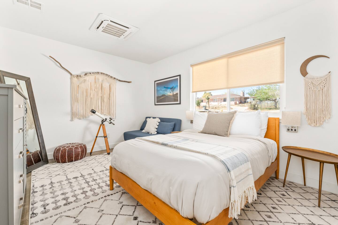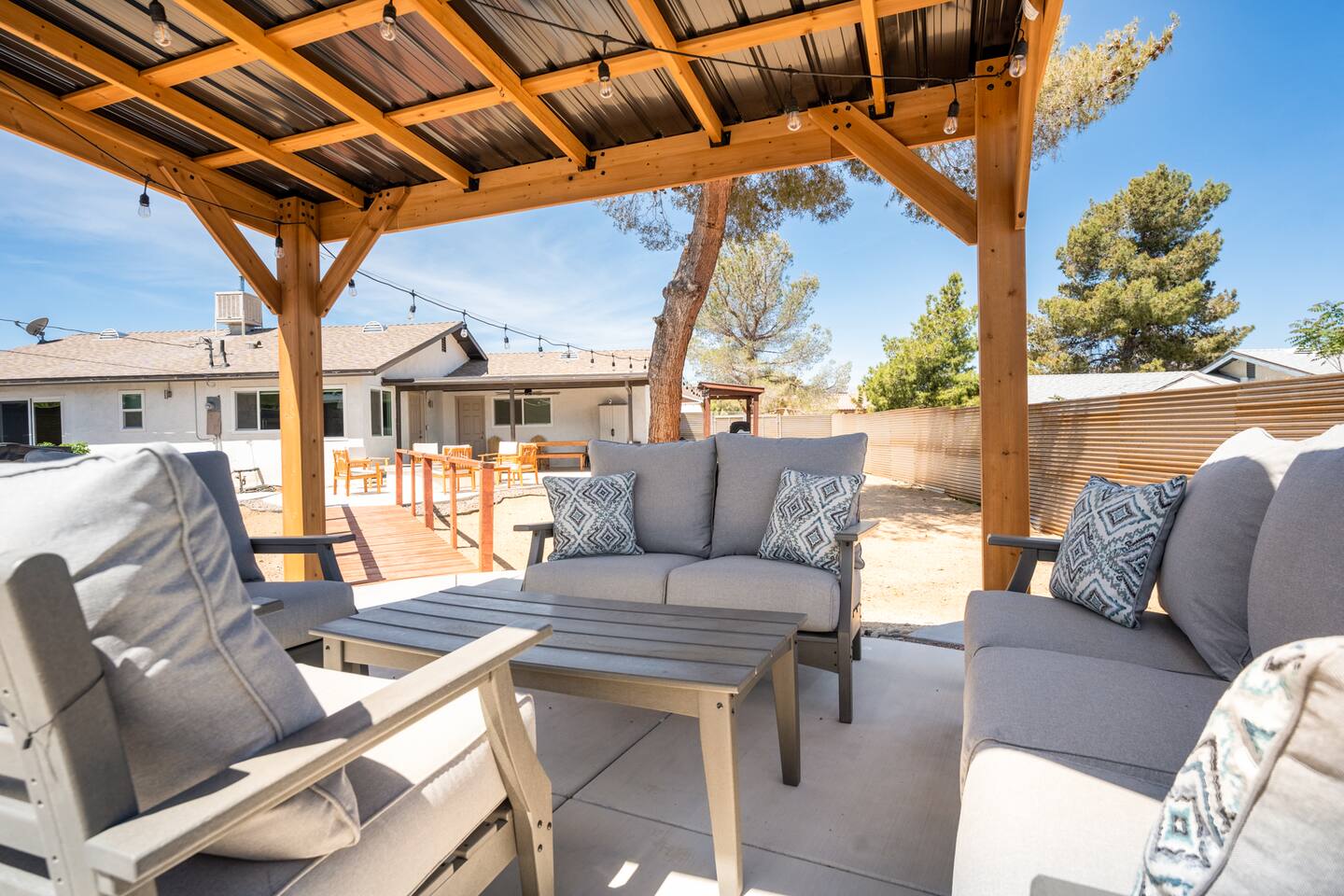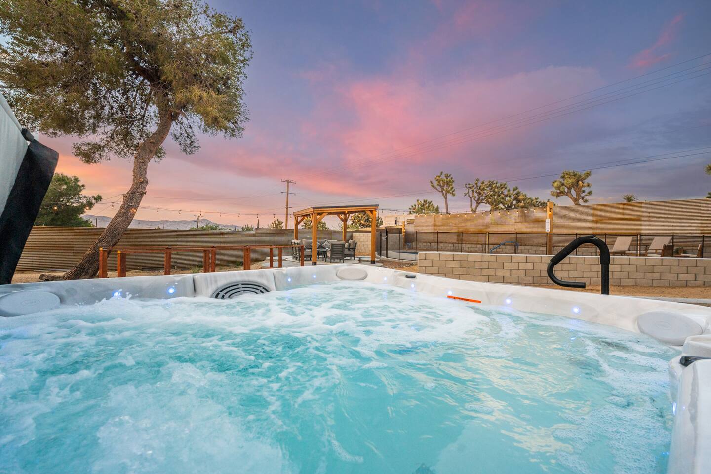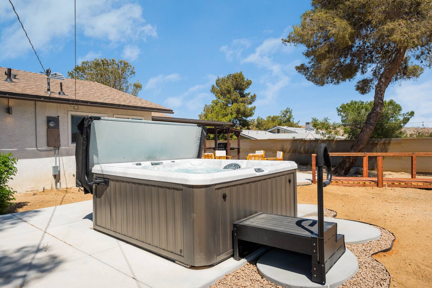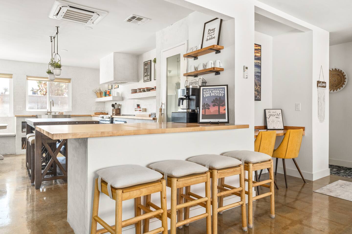 Immerse yourself in the stunning beauty of Joshua Tree National Park. This incredible area features dramatic, rugged landscapes, spectacular rock formations, and the iconic Joshua trees. Explore ancient boulder piles and rock outcroppings, take in gorgeous sunrises and sunsets, and enjoy the peaceful solitude of the desert. Joshua Tree National Park is unforgettable for all ages and a must-see for any nature enthusiast. This lovely three-bedroom house in Yucca Valley is the perfect home away from home for families or groups of up to 8. The house is ideally situated close to Joshua Tree National Park, making it easy to explore the stunning desert landscape. Inside, there’s plenty of space for everyone to relax and enjoy. Three bedrooms provide a cozy retreat for a good night’s sleep, while the in-ground pool, hot tub, game room, movie area, and fire pit ensure there’s something for everyone to do. There’s also a BBQ and cornhole for outdoor fun. You’ll be perfectly positioned to explore: 3 minutes ➔ The Copper Room 5 minutes ➔ Frontier Café & Old Town Yucca Valley 10 minutes ➔ Pappy & Harriet’s 11 minutes ➔ Joshua Tree National Park Visitor Center 12 minutes ➔ La Copine 20 minutes ➔ Integratron 40 minutes ➔ Palm Springs Bedrooms Back bedroom (primary suite): King bed, en-suite bathroom, makeup table, large closet, and TV Middle bedroom: Queen bed, closet, dresser, and TV Front bedroom: Full bed, sofa that unfolds into a full bed, closet, dresser, and TV All TVs in the house are smart TVs where you can log in to your streaming accounts. Living & Kitchen The open-plan living spaces are generously furnished with the essentials you need to make your stay comfortable. The kitchen includes: Microwave Dishwasher Coffee station Counter dining area Breakfast nook The kitchen and living areas are seamlessly combined into one room, giving guests flexibility. Cook a delicious meal while still interacting with family and friends. Game Room & Amenities There is a game room furnished with: Pool table Shuffleboard Picnic-style table Movie-watching area There is also a washer and dryer for your convenience. Highlights include: ⁕ 3 bedrooms with comfy beds plus a pull-out full sofa and twin daybeds in the living room (sleeps up to 8 guests) ⁕ Beautiful in-ground pool with patio for lounging ⁕ Spa for relaxing and stargazing at night ⁕ Large propane fire pit for gathering ⁕ Outdoor dining and seating area ⁕ Game room with pool table, shuffleboard, darts, and movie-watching area ⁕ Pet friendly – up to 2 pups welcome! ⁕ Fully equipped kitchen ⁕ Open floor plan kitchen, dining, and living area ⁕ Reliable and fast WiFi ⁕ Coffee and coffee maker ready for your morning coffee Experiences Rooted in the community, we know the desert well and enjoy sharing it with our guests. Here are some unforgettable ways to experience the area: Immerse yourself in a sound bath at the Integratron or with a local practitioner. Book an in-home massage with a trusted desert therapist. Set out on a private guided hike. Enjoy a custom meal prepared in-home by a private chef. Move and reset with a personal yoga or Pilates session. Discover the night sky on a private stargazing tour under some of California’s darkest skies. Explore canyons and creeks on a private horseback ride. Try cold plunges and wellness sessions with local experts. We’d love to connect you with our favorite local guides and practitioners.