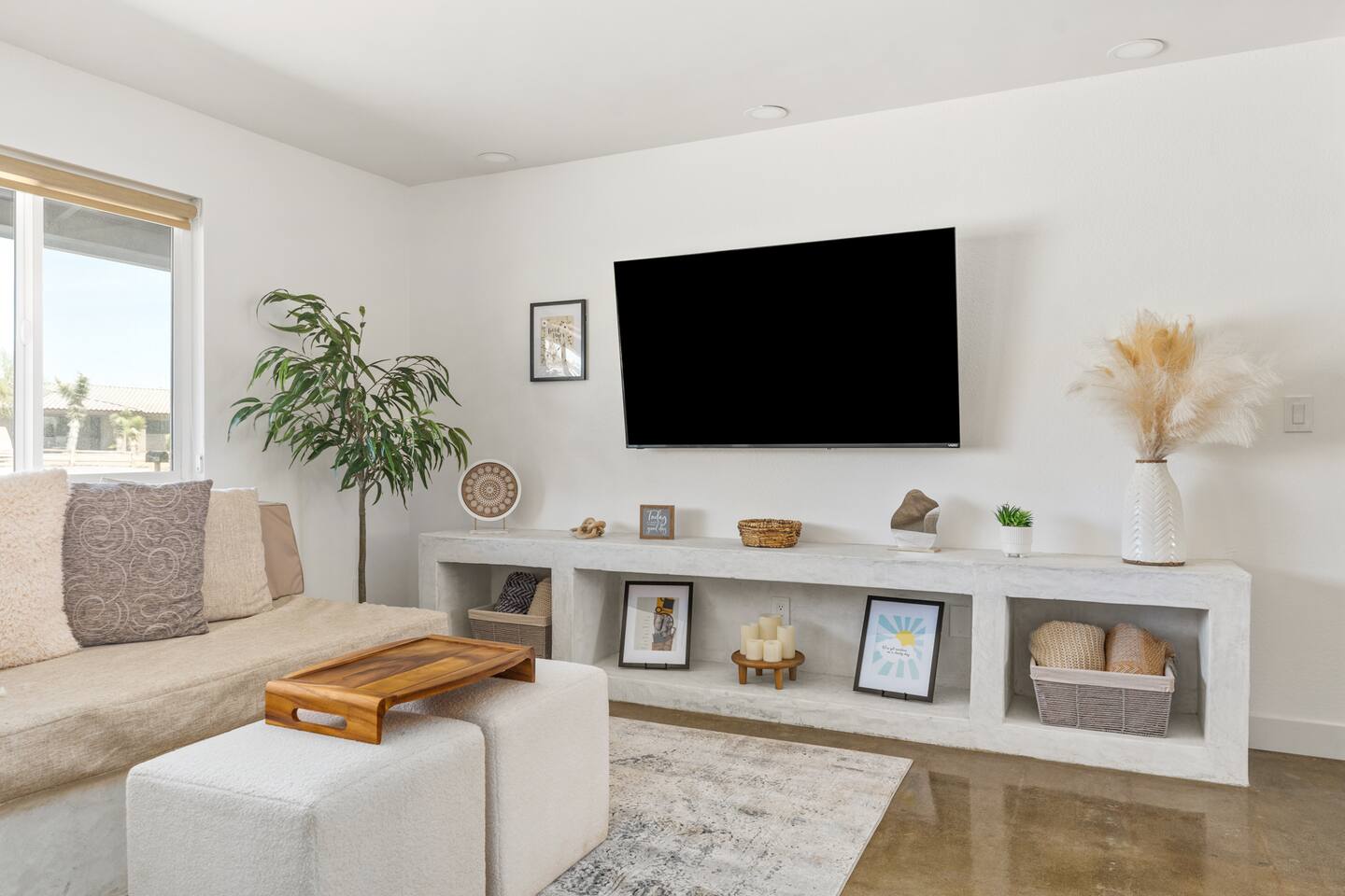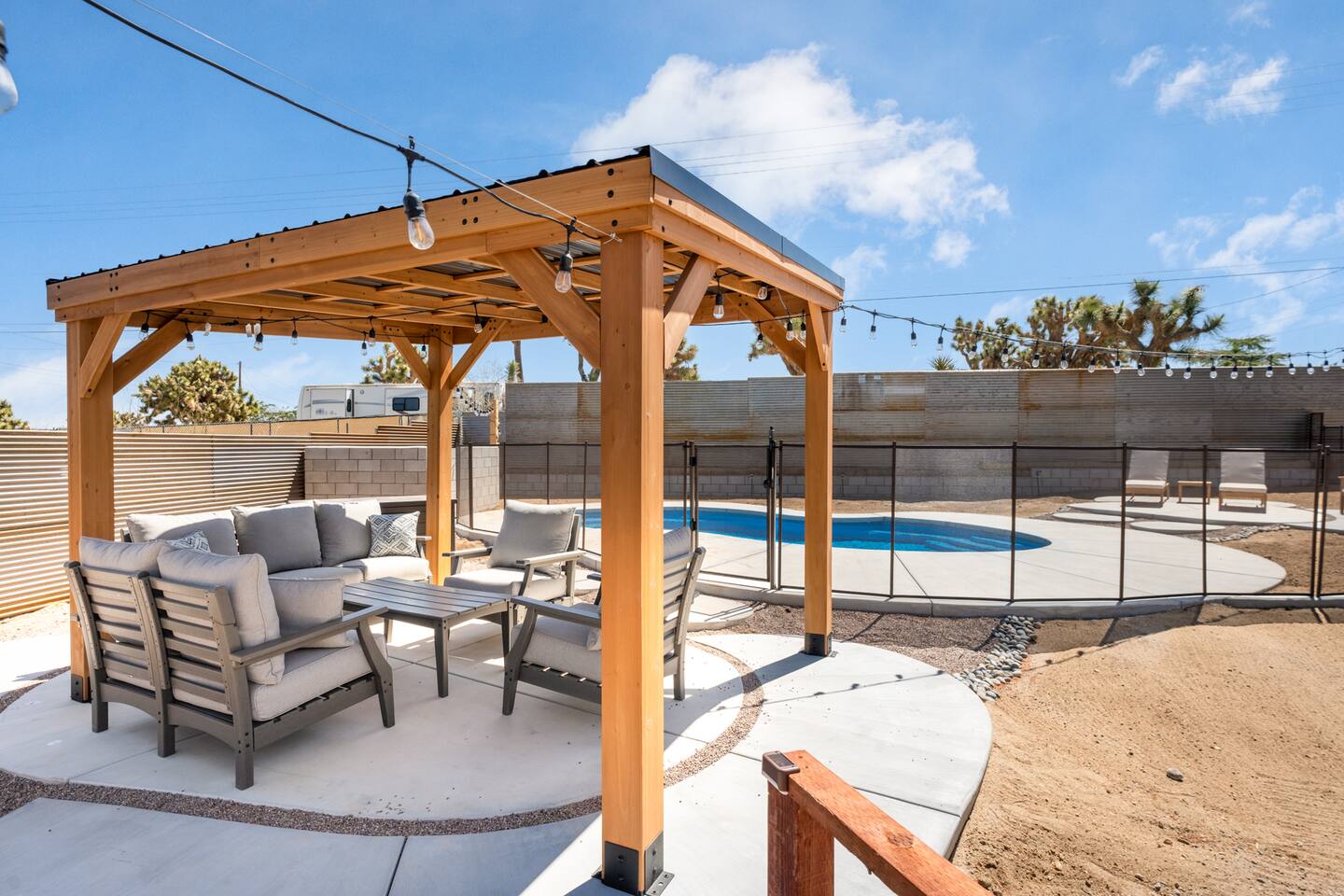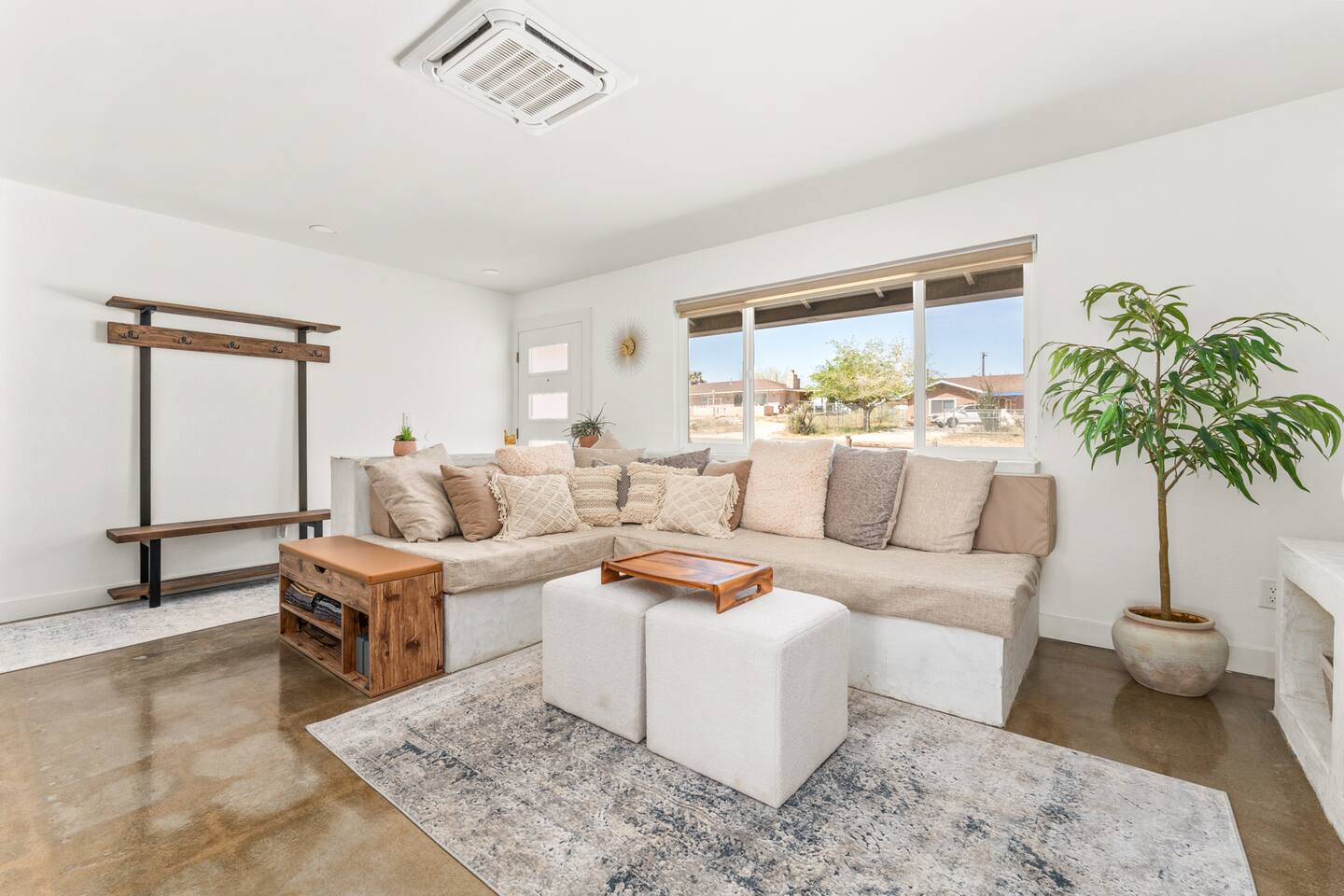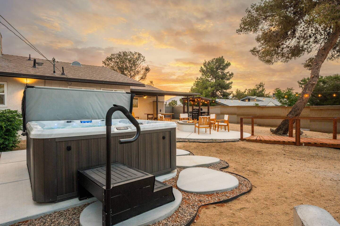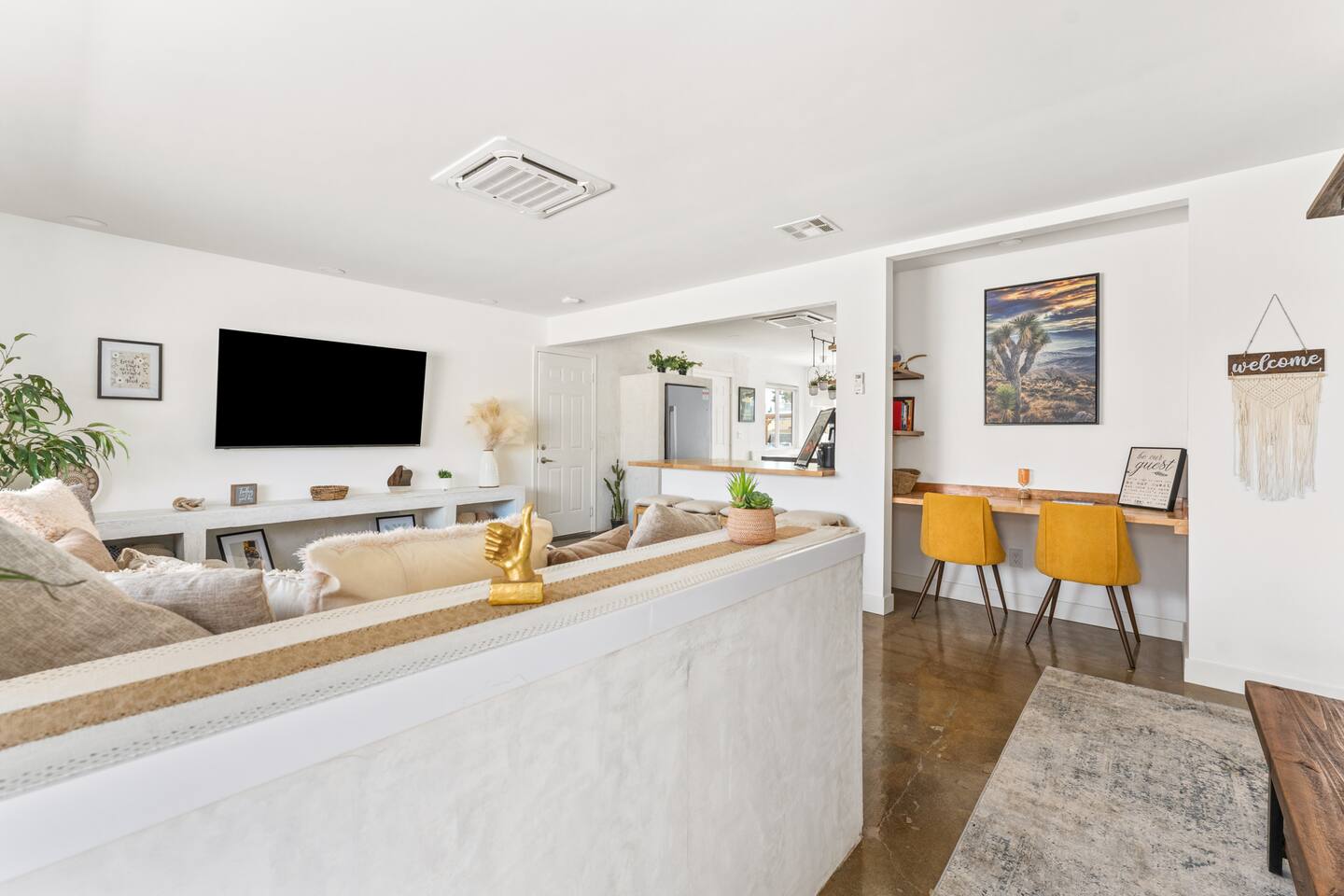 Immerse yourself in the stunning beauty of Joshua Tree National Park. This incredible area features dramatic, rugged landscapes, spectacular rock formations, and the iconic Joshua trees. Explore ancient boulder piles and rock outcroppings, take in gorgeous sunrises and sunsets, and enjoy the peaceful solitude of the desert. Joshua Tree National Park is unforgettable for all ages and a must-see for any nature enthusiast. This lovely three-bedroom house in Yucca Valley is the perfect home away from home for families or groups of up to 8. The house is ideally situated close to Joshua Tree National Park, making it easy to explore the stunning desert landscape. Inside, there’s plenty of space for everyone to relax and enjoy. Three bedrooms provide a cozy retreat for a good night’s sleep, while the in-ground pool, hot tub, game room, movie area, and fire pit ensure there’s something for everyone to do. There’s also a BBQ and cornhole for outdoor fun. You’ll be perfectly positioned to explore: 3 minutes ➔ The Copper Room 5 minutes ➔ Frontier Café & Old Town Yucca Valley 10 minutes ➔ Pappy & Harriet’s 11 minutes ➔ Joshua Tree National Park Visitor Center 12 minutes ➔ La Copine 20 minutes ➔ Integratron 40 minutes ➔ Palm Springs Bedrooms Back bedroom (primary suite): King bed, en-suite bathroom, makeup table, large closet, and TV Middle bedroom: Queen bed, closet, dresser, and TV Front bedroom: Full bed, sofa that unfolds into a full bed, closet, dresser, and TV All TVs in the house are smart TVs where you can log in to your streaming accounts. Living & Kitchen The open-plan living spaces are generously furnished with the essentials you need to make your stay comfortable. The kitchen includes: Microwave Dishwasher Coffee station Counter dining area Breakfast nook The kitchen and living areas are seamlessly combined into one room, giving guests flexibility. Cook a delicious meal while still interacting with family and friends. Game Room & Amenities There is a game room furnished with: Pool table Shuffleboard Picnic-style table Movie-watching area There is also a washer and dryer for your convenience. Highlights include: ⁕ 3 bedrooms with comfy beds plus a pull-out full sofa and twin daybeds in the living room (sleeps up to 8 guests) ⁕ Beautiful in-ground pool with patio for lounging ⁕ Spa for relaxing and stargazing at night ⁕ Large propane fire pit for gathering ⁕ Outdoor dining and seating area ⁕ Game room with pool table, shuffleboard, darts, and movie-watching area ⁕ Pet friendly – up to 2 pups welcome! ⁕ Fully equipped kitchen ⁕ Open floor plan kitchen, dining, and living area ⁕ Reliable and fast WiFi ⁕ Coffee and coffee maker ready for your morning coffee Experiences Rooted in the community, we know the desert well and enjoy sharing it with our guests. Here are some unforgettable ways to experience the area: Immerse yourself in a sound bath at the Integratron or with a local practitioner. Book an in-home massage with a trusted desert therapist. Set out on a private guided hike. Enjoy a custom meal prepared in-home by a private chef. Move and reset with a personal yoga or Pilates session. Discover the night sky on a private stargazing tour under some of California’s darkest skies. Explore canyons and creeks on a private horseback ride. Try cold plunges and wellness sessions with local experts. We’d love to connect you with our favorite local guides and practitioners.