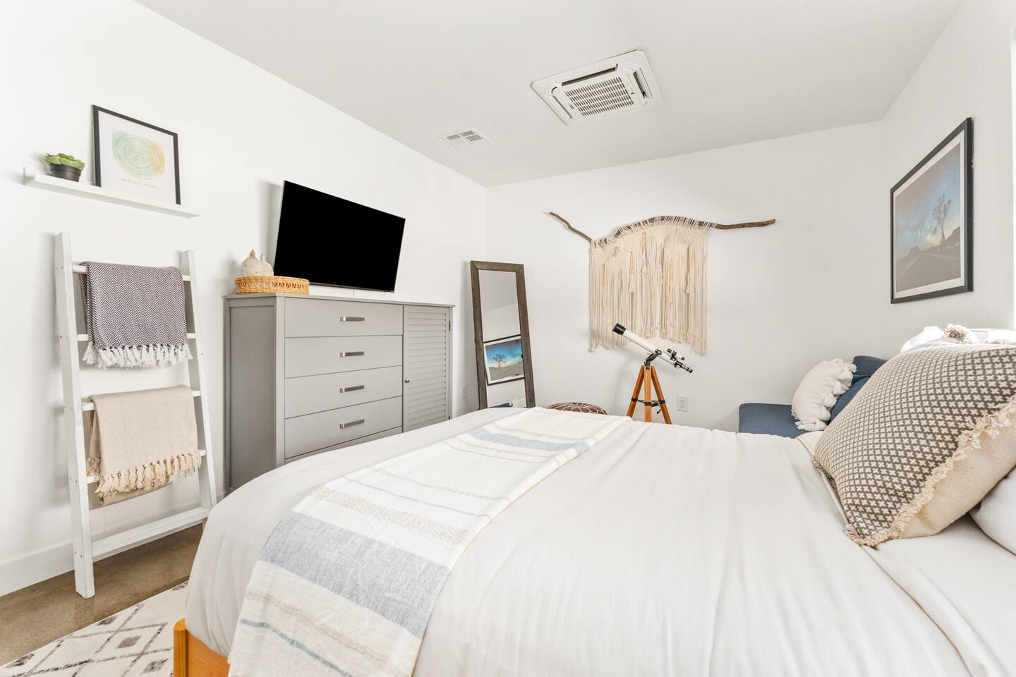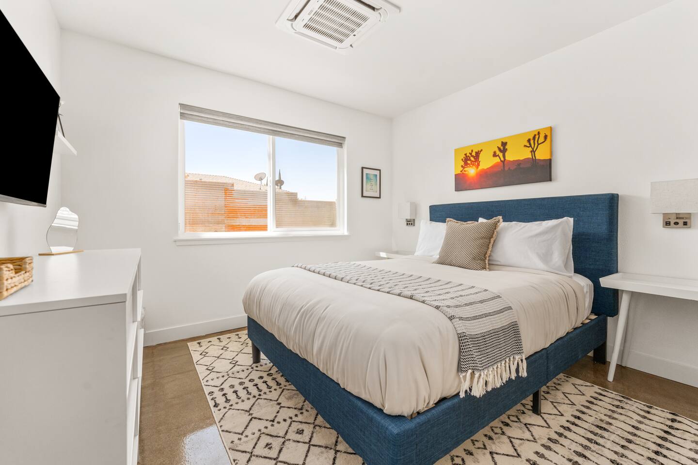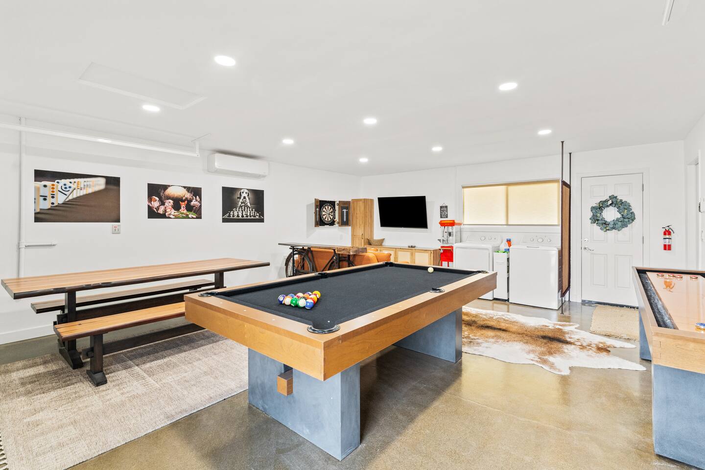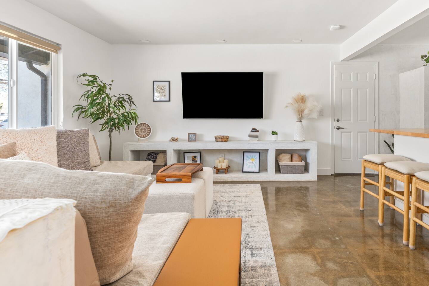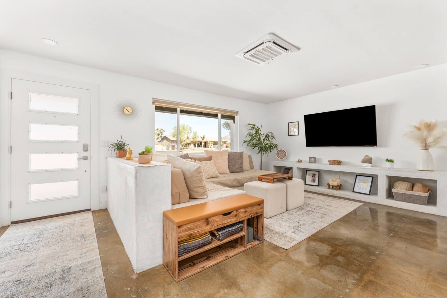 Immerse yourself in the stunning beauty of Joshua Tree National Park. This incredible area features dramatic, rugged landscapes, spectacular rock formations, and the iconic Joshua trees. Explore ancient boulder piles and rock outcroppings, take in gorgeous sunrises and sunsets, and enjoy the peaceful solitude of the desert. Joshua Tree National Park is unforgettable for all ages and a must-see for any nature enthusiast. This lovely three-bedroom house in Yucca Valley is the perfect home away from home for families or groups of up to 8. The house is ideally situated close to Joshua Tree National Park, making it easy to explore the stunning desert landscape. Inside, there’s plenty of space for everyone to relax and enjoy. Three bedrooms provide a cozy retreat for a good night’s sleep, while the in-ground pool, hot tub, game room, movie area, and fire pit ensure there’s something for everyone to do. There’s also a BBQ and cornhole for outdoor fun. You’ll be perfectly positioned to explore: 3 minutes ➔ The Copper Room 5 minutes ➔ Frontier Café & Old Town Yucca Valley 10 minutes ➔ Pappy & Harriet’s 11 minutes ➔ Joshua Tree National Park Visitor Center 12 minutes ➔ La Copine 20 minutes ➔ Integratron 40 minutes ➔ Palm Springs Bedrooms Back bedroom (primary suite): King bed, en-suite bathroom, makeup table, large closet, and TV Middle bedroom: Queen bed, closet, dresser, and TV Front bedroom: Full bed, sofa that unfolds into a full bed, closet, dresser, and TV All TVs in the house are smart TVs where you can log in to your streaming accounts. Living & Kitchen The open-plan living spaces are generously furnished with the essentials you need to make your stay comfortable. The kitchen includes: Microwave Dishwasher Coffee station Counter dining area Breakfast nook The kitchen and living areas are seamlessly combined into one room, giving guests flexibility. Cook a delicious meal while still interacting with family and friends. Game Room & Amenities There is a game room furnished with: Pool table Shuffleboard Picnic-style table Movie-watching area There is also a washer and dryer for your convenience. Highlights include: ⁕ 3 bedrooms with comfy beds plus a pull-out full sofa and twin daybeds in the living room (sleeps up to 8 guests) ⁕ Beautiful in-ground pool with patio for lounging ⁕ Spa for relaxing and stargazing at night ⁕ Large propane fire pit for gathering ⁕ Outdoor dining and seating area ⁕ Game room with pool table, shuffleboard, darts, and movie-watching area ⁕ Pet friendly – up to 2 pups welcome! ⁕ Fully equipped kitchen ⁕ Open floor plan kitchen, dining, and living area ⁕ Reliable and fast WiFi ⁕ Coffee and coffee maker ready for your morning coffee Experiences Rooted in the community, we know the desert well and enjoy sharing it with our guests. Here are some unforgettable ways to experience the area: Immerse yourself in a sound bath at the Integratron or with a local practitioner. Book an in-home massage with a trusted desert therapist. Set out on a private guided hike. Enjoy a custom meal prepared in-home by a private chef. Move and reset with a personal yoga or Pilates session. Discover the night sky on a private stargazing tour under some of California’s darkest skies. Explore canyons and creeks on a private horseback ride. Try cold plunges and wellness sessions with local experts. We’d love to connect you with our favorite local guides and practitioners.