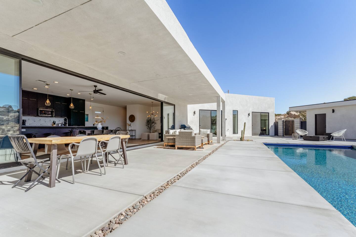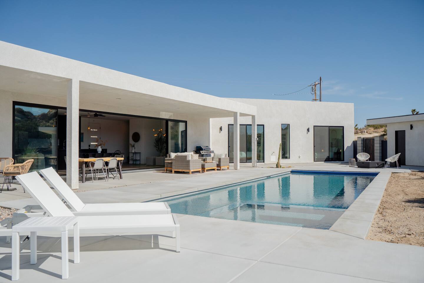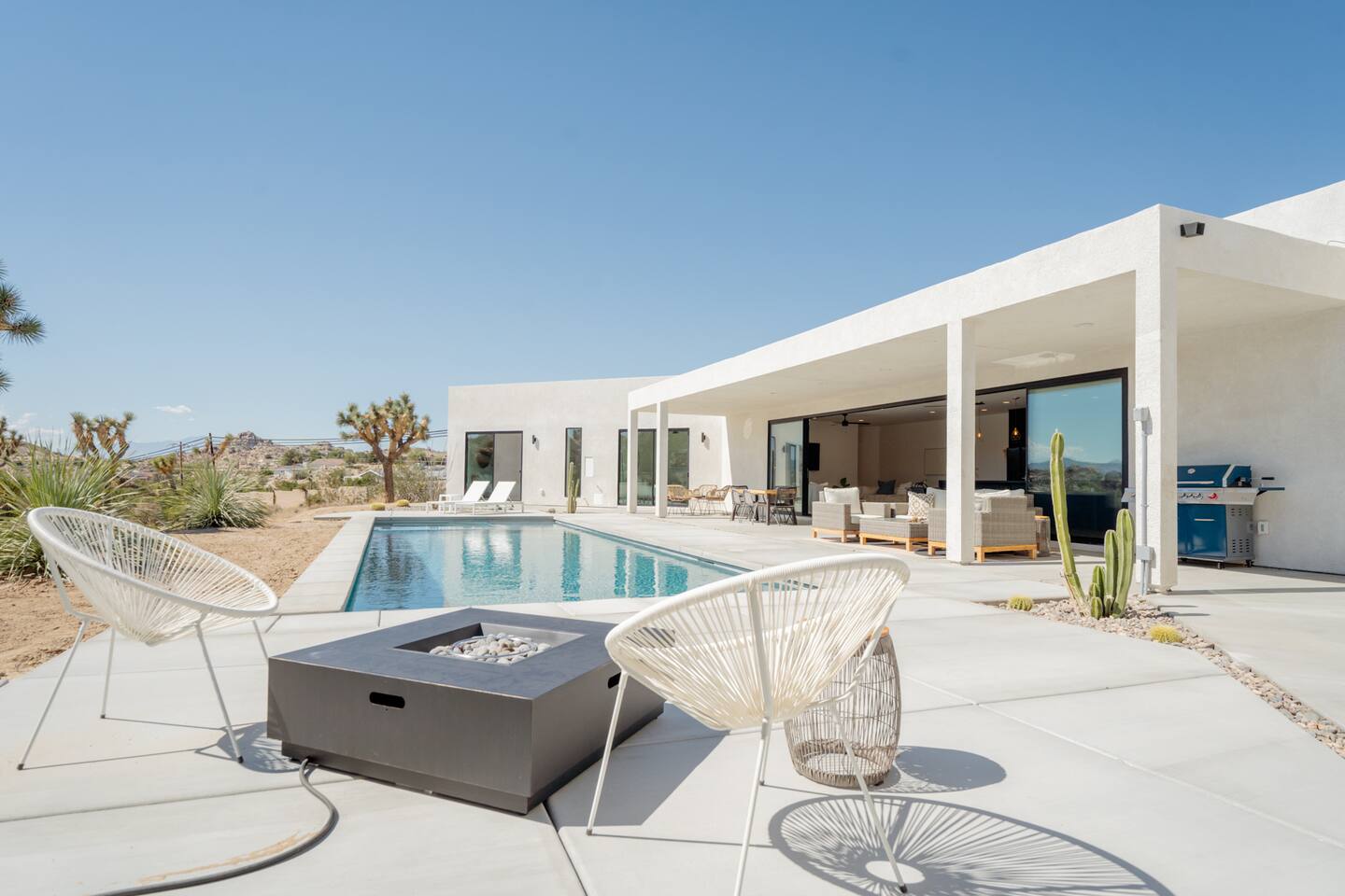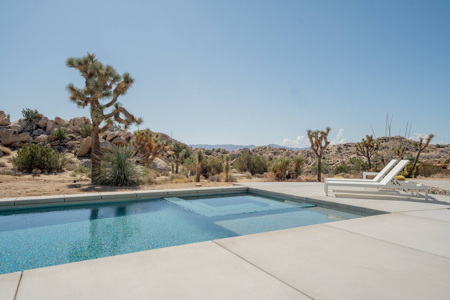 Welcome to Mars Landing, a striking modern desert home featured in Dwell, set among boulders and big open views just minutes from Joshua Tree National Park. Highlights 4 bedrooms, 4 bathrooms (all ensuite) Private pool + spa tucked into dramatic boulders Fire pit for nights under the stars 30-foot sliding glass wall that opens fully to the desert Game zone with ping pong + foosball Starlink high-speed internet for streaming and remote work Close to JTNP, La Copine, and Pappy & Harriet’s