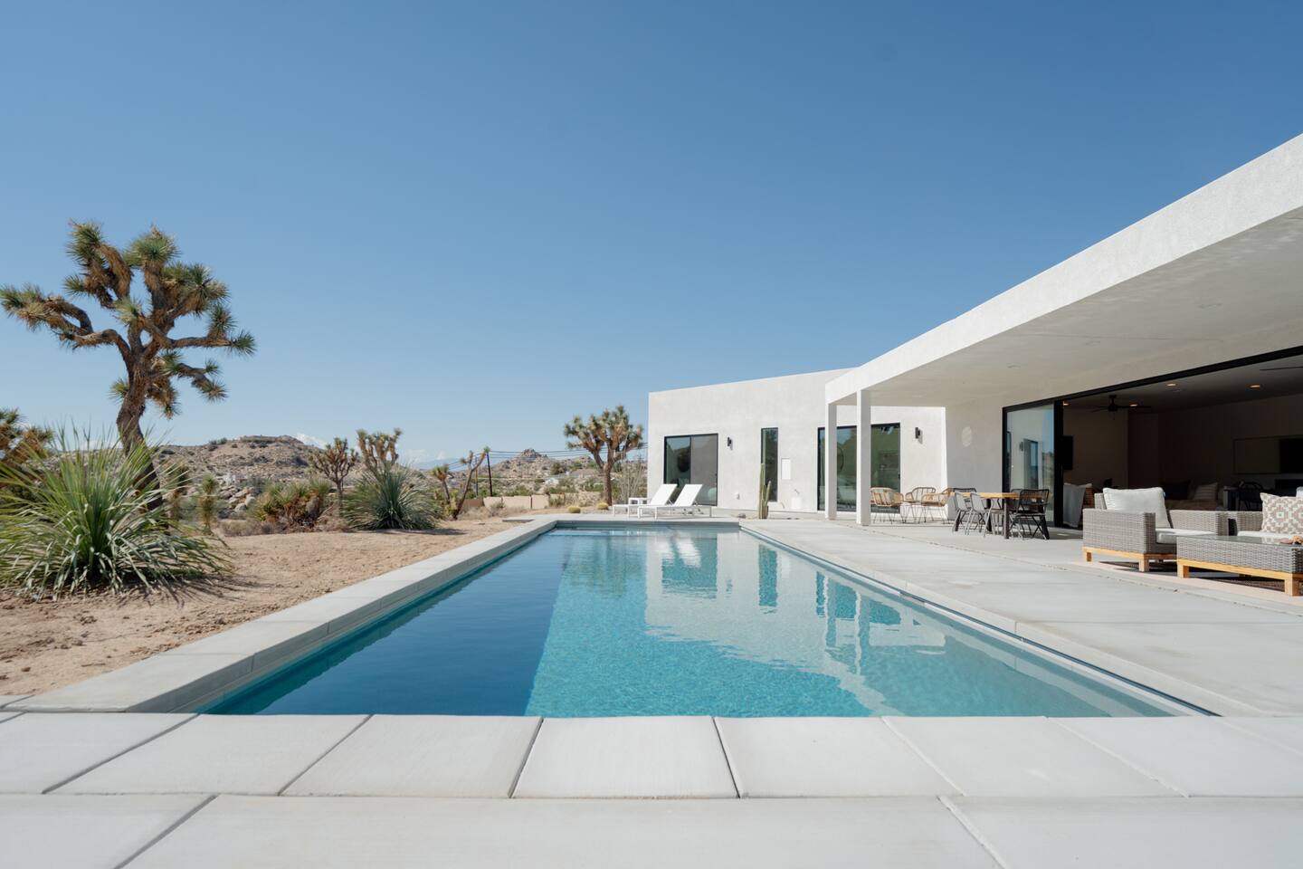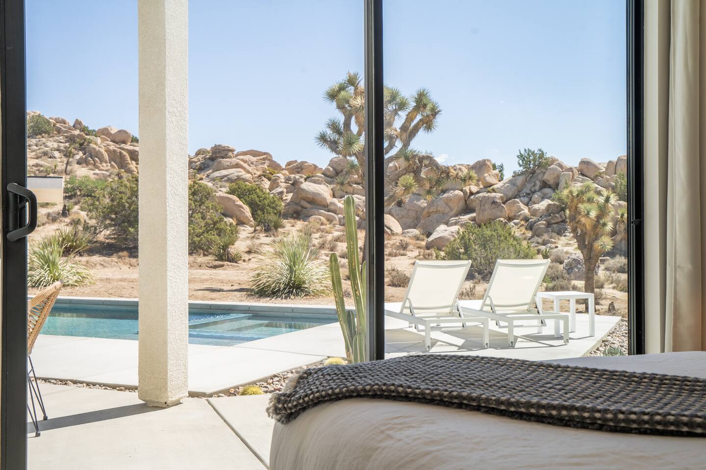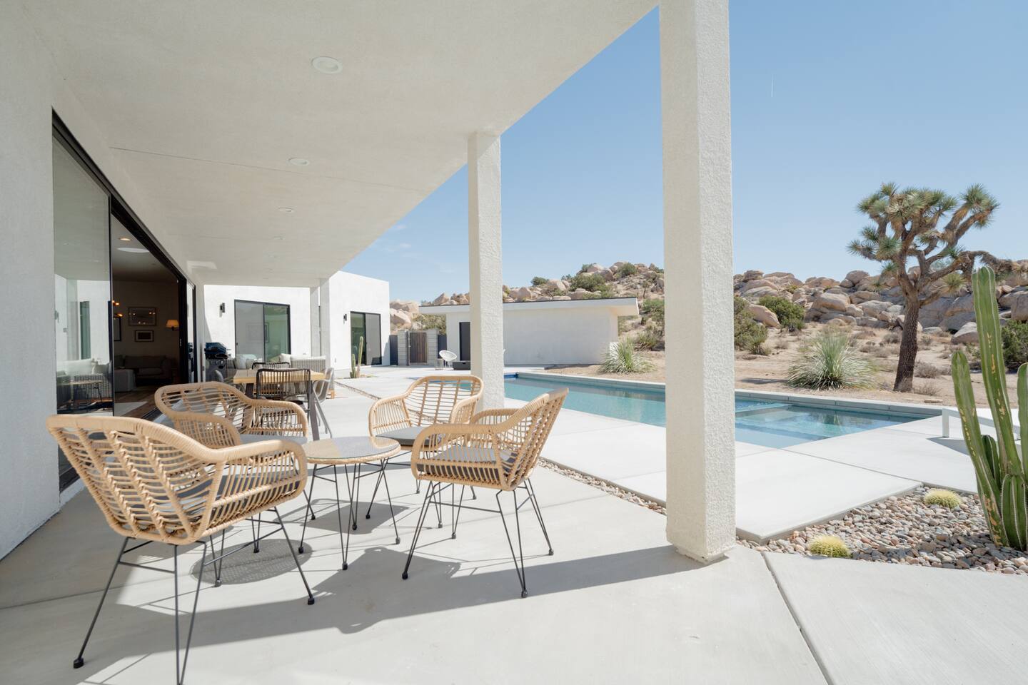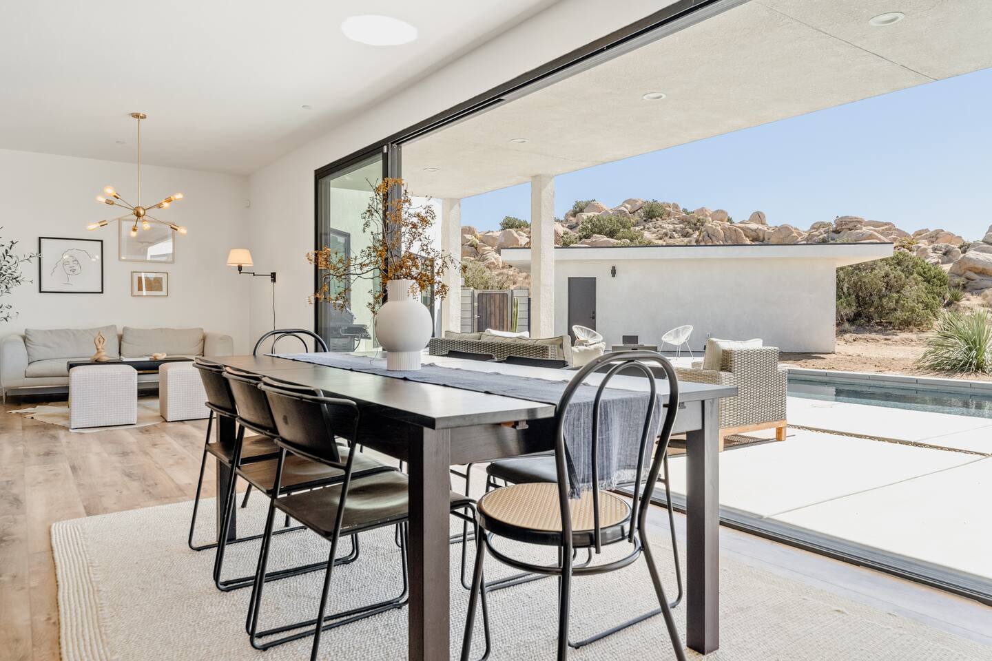 Welcome to Mars Landing, a striking modern desert home featured in Dwell, set among boulders and big open views just minutes from Joshua Tree National Park. Highlights 4 bedrooms, 4 bathrooms (all ensuite) Private pool + spa tucked into dramatic boulders Fire pit for nights under the stars 30-foot sliding glass wall that opens fully to the desert Game zone with ping pong + foosball Starlink high-speed internet for streaming and remote work Close to JTNP, La Copine, and Pappy & Harriet’s