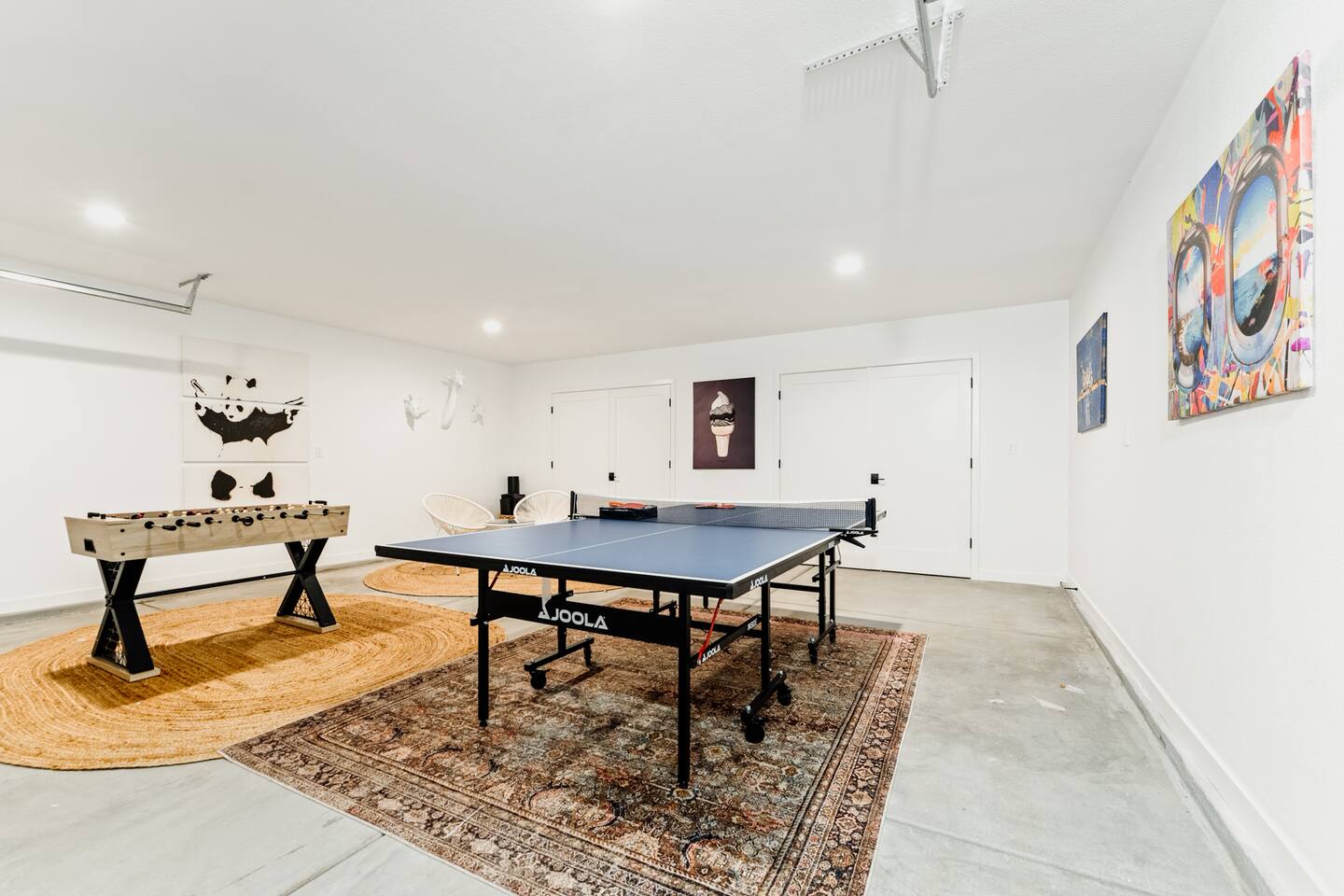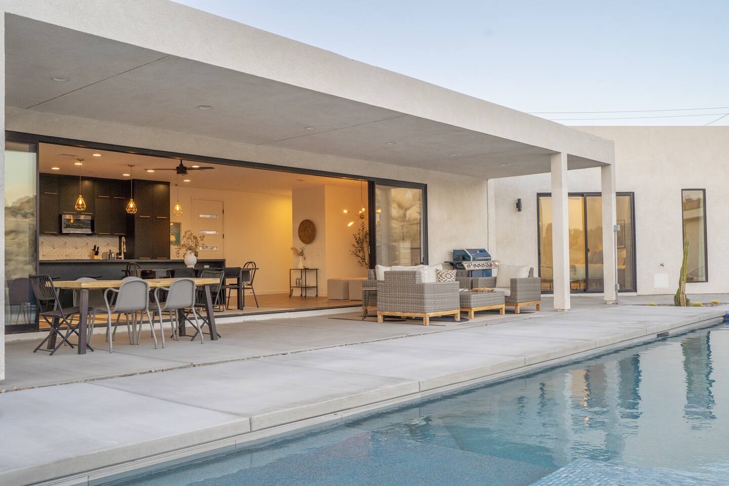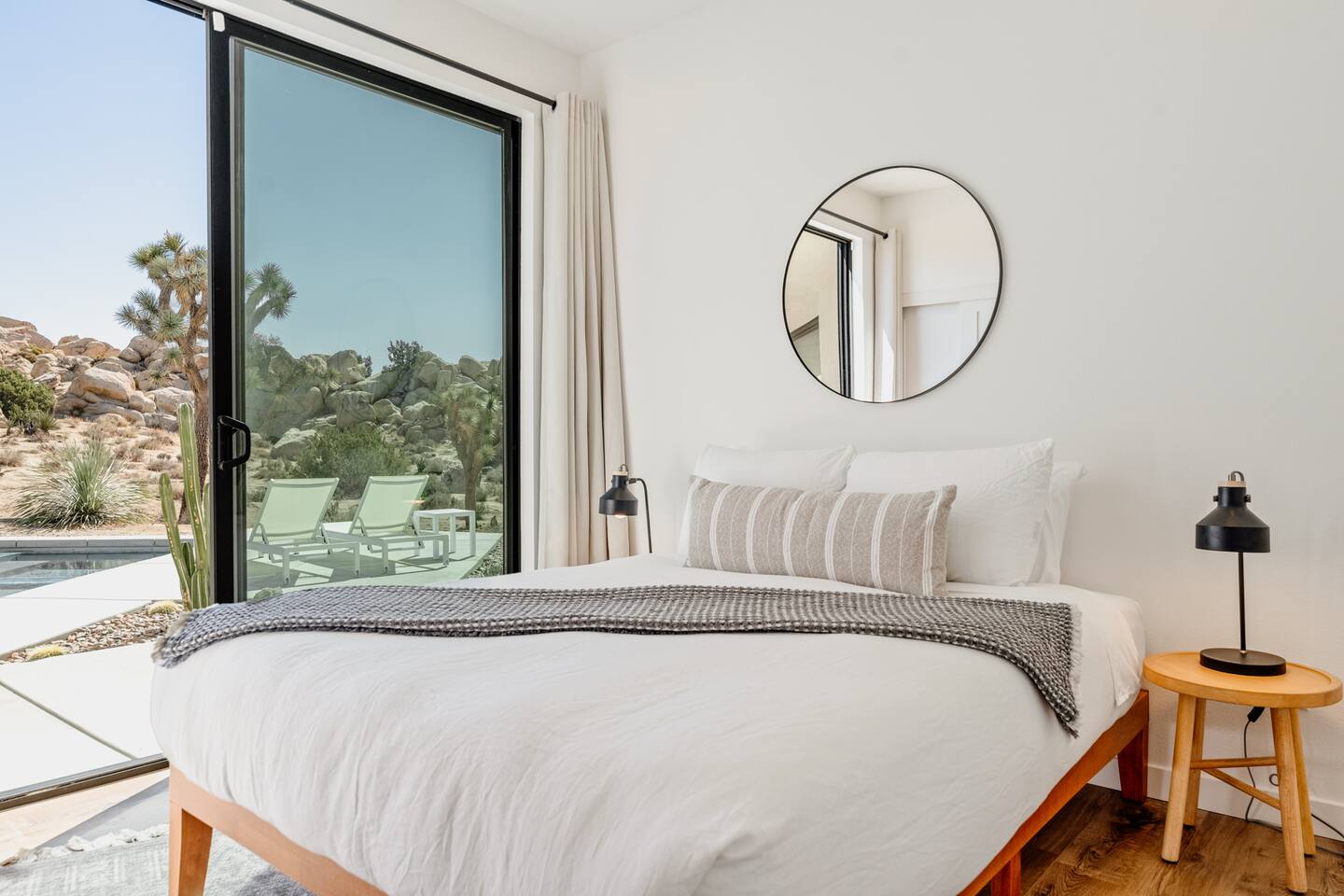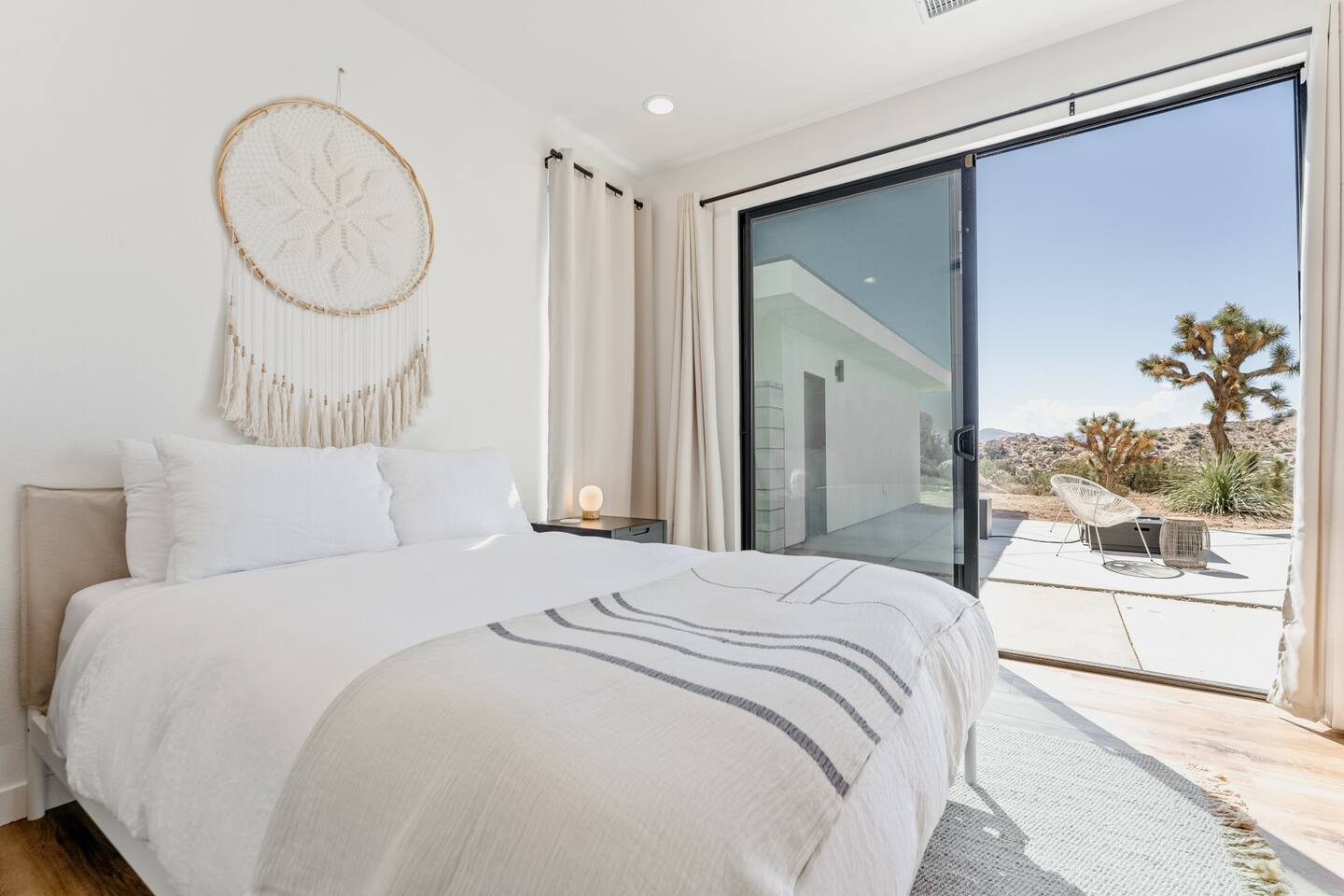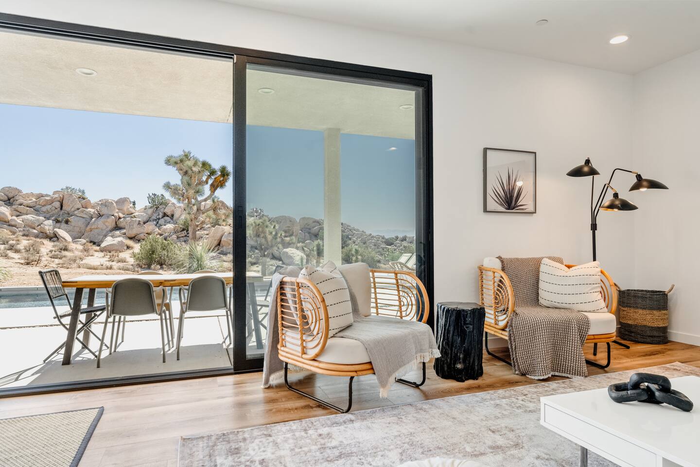 Mars Landing is made for easy group trips where everyone gets their own space. With four ensuite bedrooms, you’ll have comfort and privacy built in, plus a layout that still feels connected. The main living area is open, bright, and designed for hanging out, cooking, and slow mornings. A 30-foot glass door slides completely open, so the whole house flows right out to the pool deck and desert beyond. Views are everywhere. Outdoor Living This is the good stuff: swim in the sun, soak in the spa at sunset, then move to the fire pit when the temperature drops. The boulders, Joshua trees, and mountain backdrop make it feel cinematic, but still calm and private. Entertainment + Amenities A separate recreation area keeps the group entertained with ping pong and foosball, and Starlink makes it easy to work, stream, or stay connected without drama. Great Location 5 mins ➔ Grocery stores 8 mins ➔ La Copine 9 mins ➔ Joshua Tree Saloon 10 mins ➔ Pappy & Harriet’s 15 mins ➔ Joshua Tree National Park Quick Note on Road Noise Please note the home is located just off a busier road, so you may hear some road noise when outside. It can be more noticeable on weekdays and just before and after holidays. For most guests it hasn’t been an issue. The upside is the convenience. You’re close to shops, restaurants, and everything you’ll want to explore, which makes getting around easy. Local Experiences Enhance your stay with thoughtfully curated local experiences: Sound baths at the Integratron or with a local practitioner Massage, bodywork, or energy sessions at the house Private guided desert hikes and nature walks Yoga, Pilates, or breathwork under open skies Private chef dinners and in-home dining Stargazing and astronomy tours Horseback rides through desert trails Cold plunges and wellness sessions with local experts We’d love to connect you with our favorite local guides and practitioners.
