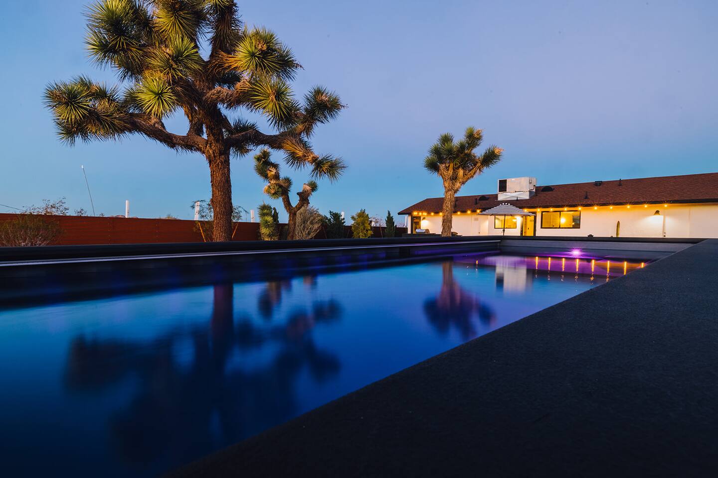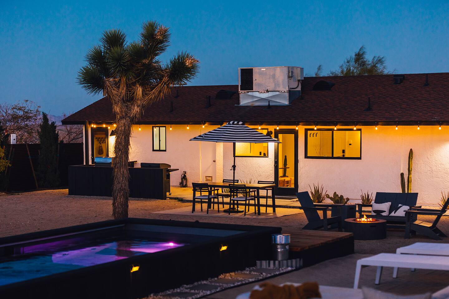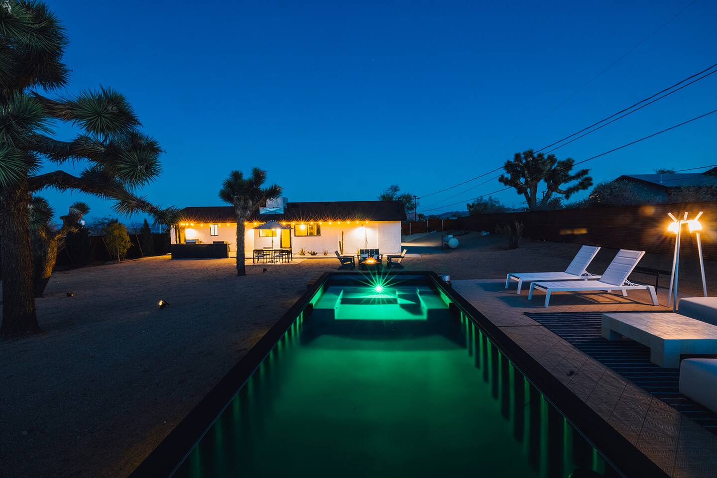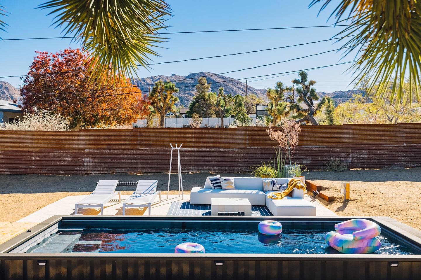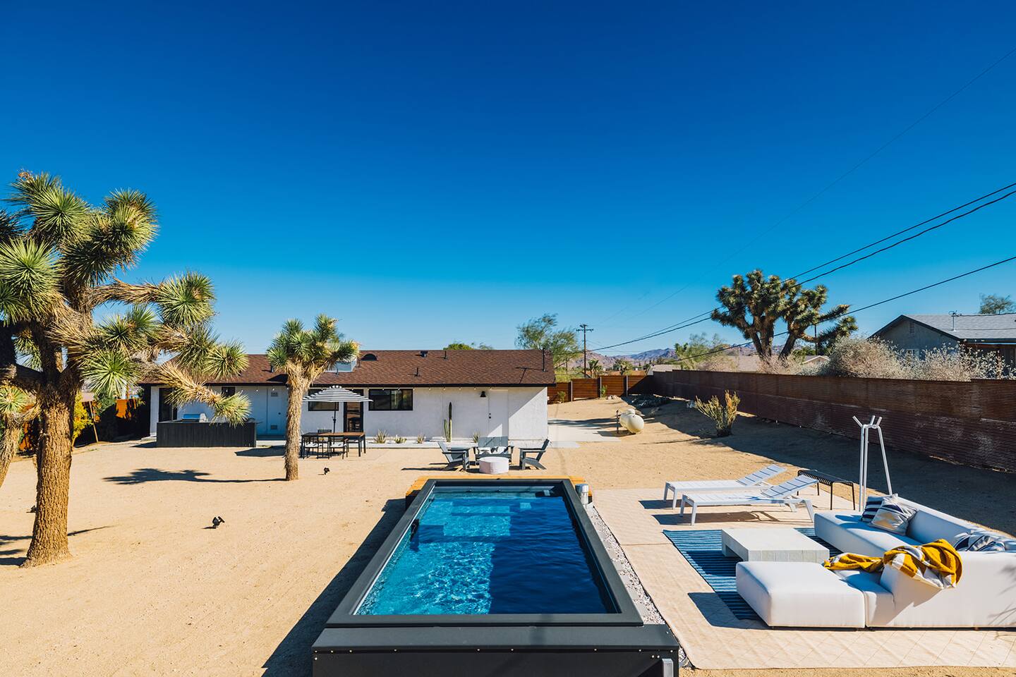 A desert retreat designed for rest, connection, and simple luxury. Casa Demesne pairs clean architecture with natural textures and calm desert tones. Relax & Unwind: - Custom built-in sofa - Smart TV for streaming - Board games and puzzles for downtime - Cook & Enjoy - Fully equipped kitchen with terrazzo countertops - Induction stove, ANOVA Sous Vide, KitchenAid processor, Ninja blender - Freshly roasted Joshua Tree Coffee with multiple brewing options Restful Bedrooms: Two inviting bedrooms, each with queen beds and memory-foam mattresses Refresh & Recharge: Full bathroom with shower/tub combo and complimentary toiletries Outdoor Living: - Stylish container pool + spa ($85/day for heat) - Spacious, private fenced yard - Outdoor kitchen with Weber grill + Blackstone griddle - Propane fire pit for stargazing - Outdoor shower for rinsing under the stars Local Experiences: Enhance your stay with thoughtfully curated local experiences. Sound baths at the Integratron or with a local practitioner. Massage, bodywork, or energy sessions at the house. Guided desert hikes and nature walks. Yoga, Pilates, or breathwork under open skies. Private chef dinners and in-home dining. Stargazing and astronomy tours. Horseback rides through desert trails. Cold plunges and wellness sessions with local experts. We’d love to connect you with our favorite local guides and practitioners.