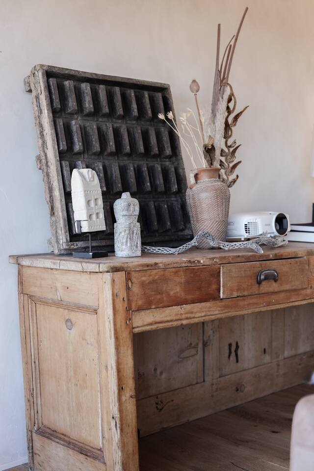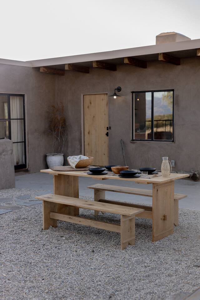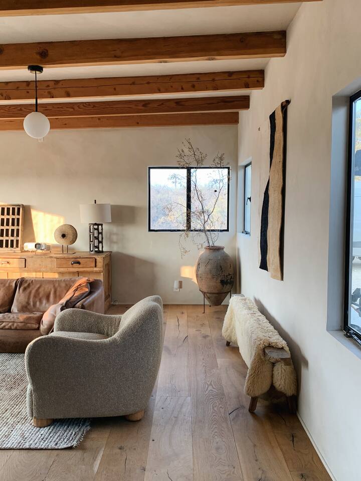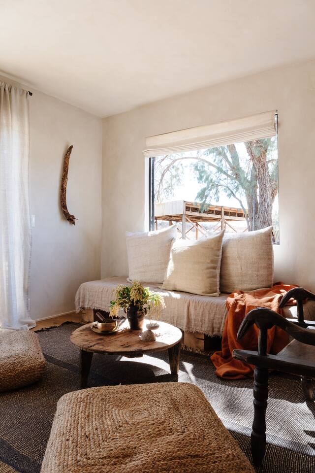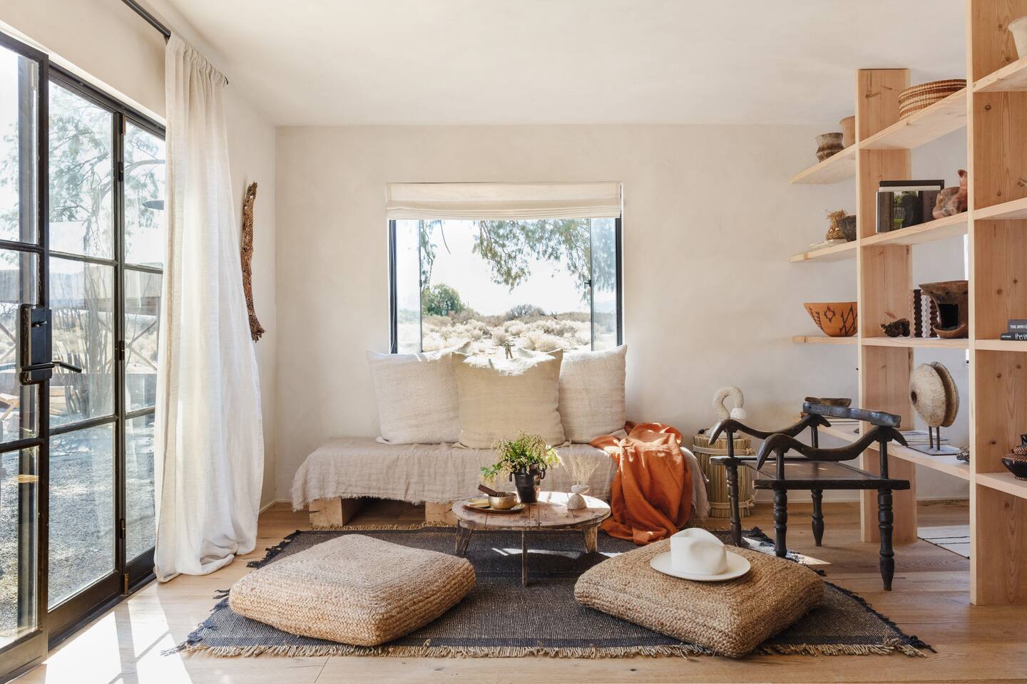 Nestled in the vast dunes of 29 Palms, is a secluded and tranquil desert retreat called Arro Dunes with 360 mountain views that sits on 10 unfenced acres once home to the Chemehuevi tribe. Designed with a strong focus on organic materials and fusing inspiration from Japanese wabi-sabi aesthetics (the acceptance of imperfections) and minimalist primitive decor, the home brings a beautiful balance of thoughtfully sourced one-of-a-kind antiques alongside modern luxuries.