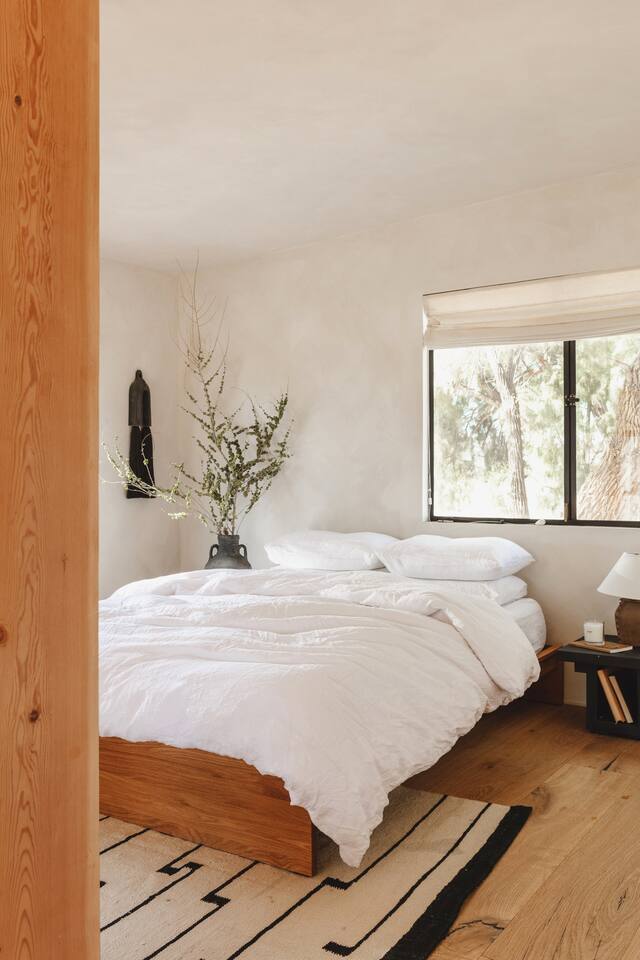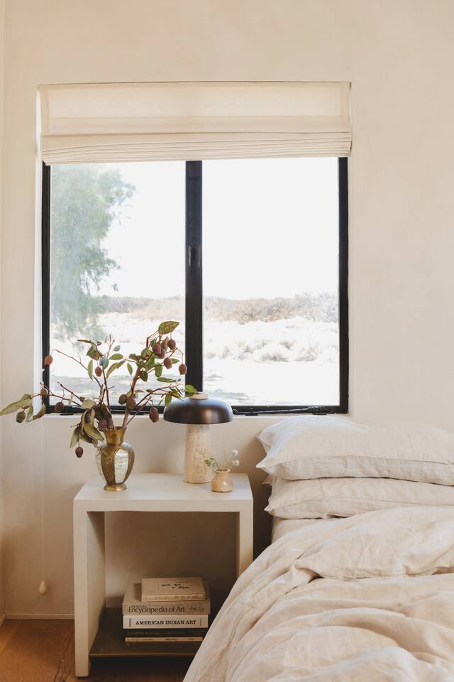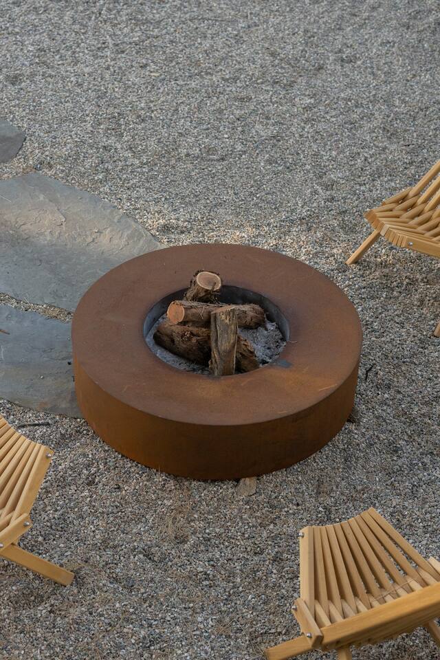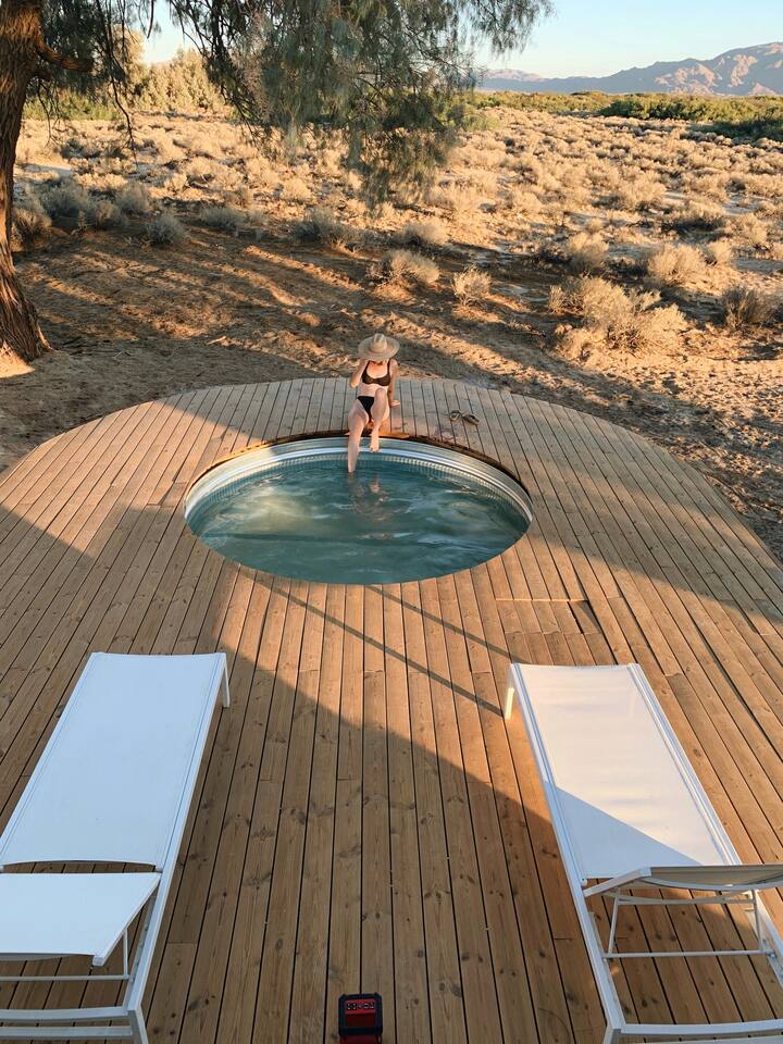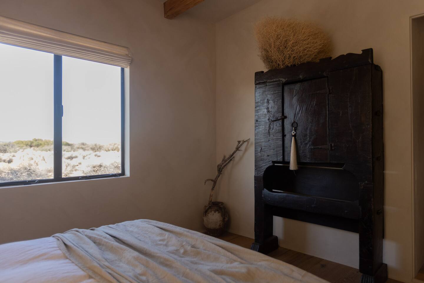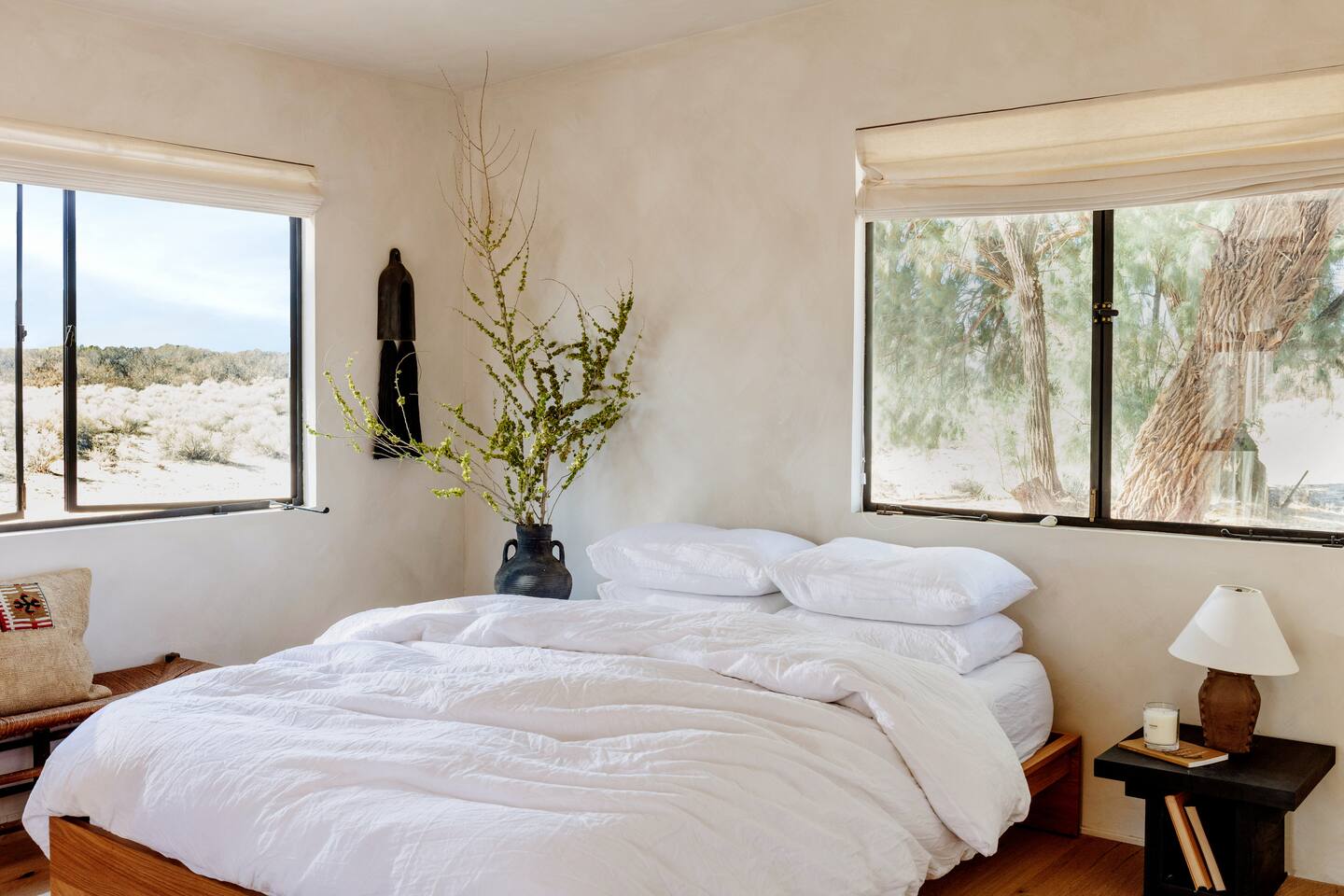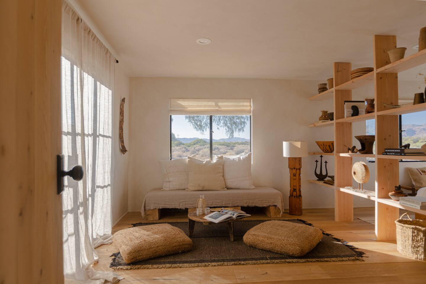 The entire home has been lovingly renovated, with many of the final touches having been built by us, characterizing the distinctive textures and light of each room. Minimalist decor and neutral palettes connect you to the desert surroundings and offer space to sink into the world around. Originally built as a desert homestead in 1957, the two bedroom one bathroom home comfortably sleeps up to 4 guests. Dual bi-folding french doors provide a connection to the outdoors as guests enjoy the seating and tea room in the large bedroom. The brick fireplace with steel hood is original to the home, designed and handbuilt by the original owners, and is a key focal point to the homes’ architecture. Mornings spent sipping coffee, or evening cocktails, next to our expansive original living room window, provide some of the best moments to recharge. At night, the firepit and 100 sq ft deck offer unending stargazing opportunities while the 10’ foot stock tank is a summer retreat. The home sits off a dirt road in a small and peaceful neighborhood, navigable by any vehicle and is designed to be an oasis for slow living, away from the noises of the city, though not far from local amenities. Whether you’re seeking a relaxing quiet retreat or romantic getaway, Arro Dunes is the perfect sanctuary to find peace and solitude. AMENITIES: - Wood burning hot tub (available year round) - Queen size Tuft & Needle beds with 100% flax linen Bed Threads sheets - Organic cotton bedding and down pillows - Brooklinen bath linens - Malin & Goetz bathroom amenities - A/C and heat in every room - August Wifi Remote lock with keycode - WiFi throughout the home (there is also cell service at our location) - Movie theater projector with Samsung TV including Netflix, Hulu, Disney+, Amazon Prime, and many other streaming channels (guests sign in to their own accounts) - Indoor gas fireplace - Bluetooth speaker - Wood-Burning BBQ - Outdoor Dining space - Horseshoe and Bocce ball court - Fully fitted kitchen with Smeg refrigerator, stove top and oven, Vitamix blender, Chemex and Fellow electric tea kettle. Our kitchen is suited for light cooking and simple meals. - Tastefully furnished with high-end furniture, custom-built pieces, and one-of-a-kind vintage and antiques collected from around the world - Outdoor wood-burning fire pit with expansive desert views - 10 foot cowboy pool built into a 200 sq ft deck (open April - Oct) - Privately located, fifteen minute drive to the east entrance of Joshua Tree National Park, ten minutes to downtown Twentynine Palms, and 20 minutes to central Joshua Tree - Bocce ball and horseshoe pit LOCAL EXPERIENCES: Make the most of your time here with our favorite local experiences: Sound bath at the Integratron or with a local practitioner In-home massage or bodywork session Private guided desert hike Chef-prepared dinner at home Yoga or Pilates under open skies Private stargazing tour Horseback ride through canyons and washes