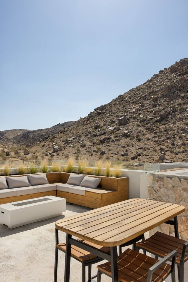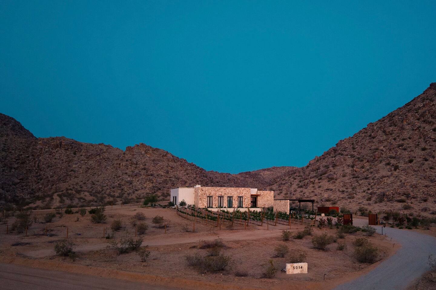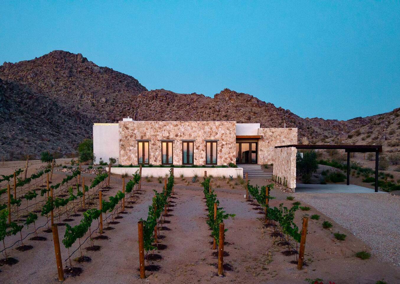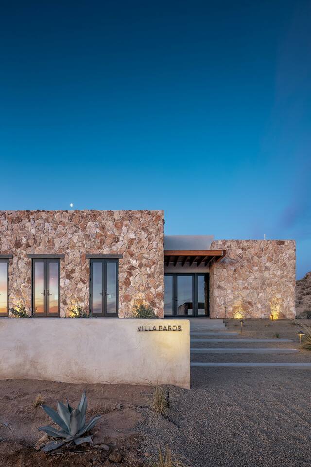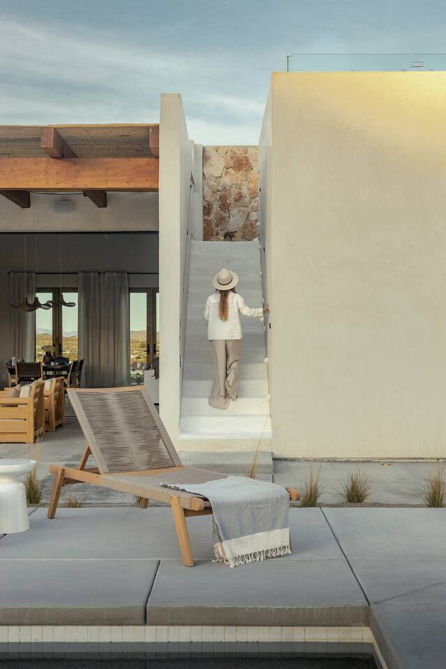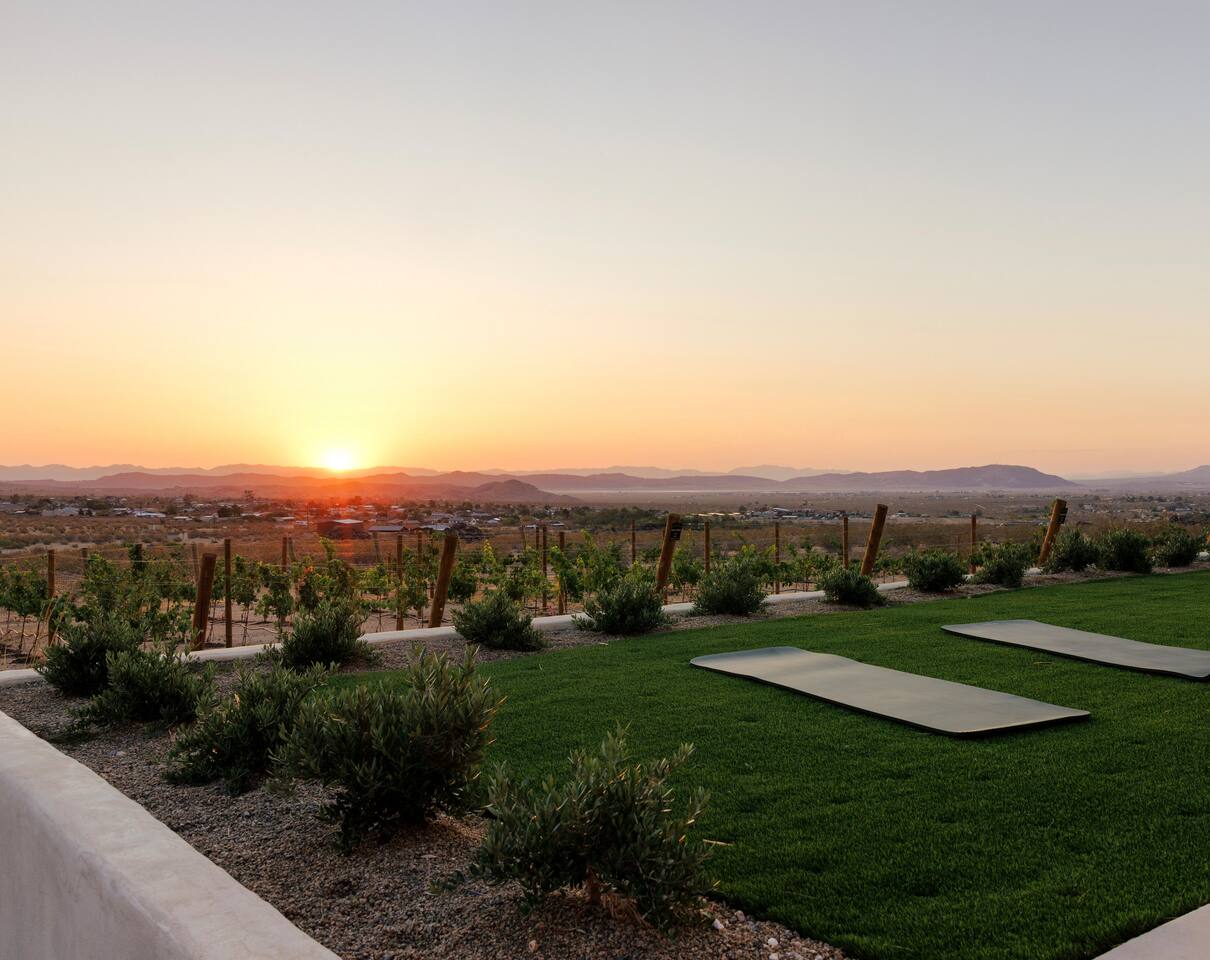 Villa Paros is your private 3-acre escape where Mediterranean ease meets high desert beauty. This thoughtfully designed 3-bedroom villa is rooted in the landscape, surrounded by native flora, sculpted with architectural simplicity, and infused with indoor-outdoor flow. Step into the calm: • Heated pool and spa framed by mountain views • Yoga lawn overlooking our private vineyard • Rooftop and poolside fire pits for golden hour rituals • Working vineyard with four Mediterranean varietals, harvested each September for wine • Direct access to scenic Bartlett Mountains hiking trails just behind the property • Outdoor dining, gas grill, and star-studded nights • EV charger Each bedroom is tailored for rest, with plush bedding, TVs, and high-speed WiFi. The entire property is gated and fully fenced for peace of mind and total privacy. Whether you're lounging poolside, exploring nearby trails, or gathering around the fire, Villa Paros offers a stay that’s both grounding and elevated. Experiences: Rooted in the community, we know the desert well and enjoy sharing it with our guests. Here are some unforgettable ways to experience the area. - Immerse yourself in a sound bath at the Integratron or with a local practitioner. - Book an in-home massage with a trusted desert therapist. - Set out on a private guided hike. - Enjoy a custom meal prepared in-home by a private chef. - Move and reset with a personal Yoga or Pilates session. - Discover the night sky on a private stargazing tour under some of California’s darkest skies. - Explore canyons and creeks on a private horseback ride. - Cold plunges and wellness sessions with local experts. We’d love to connect you with our favorite local guides and practitioners.
