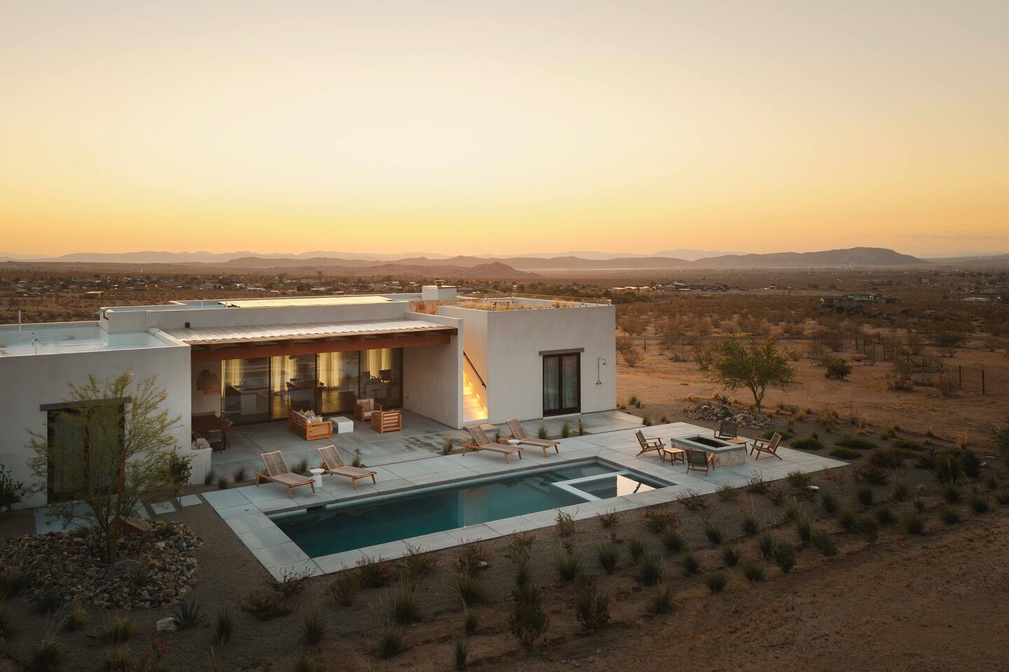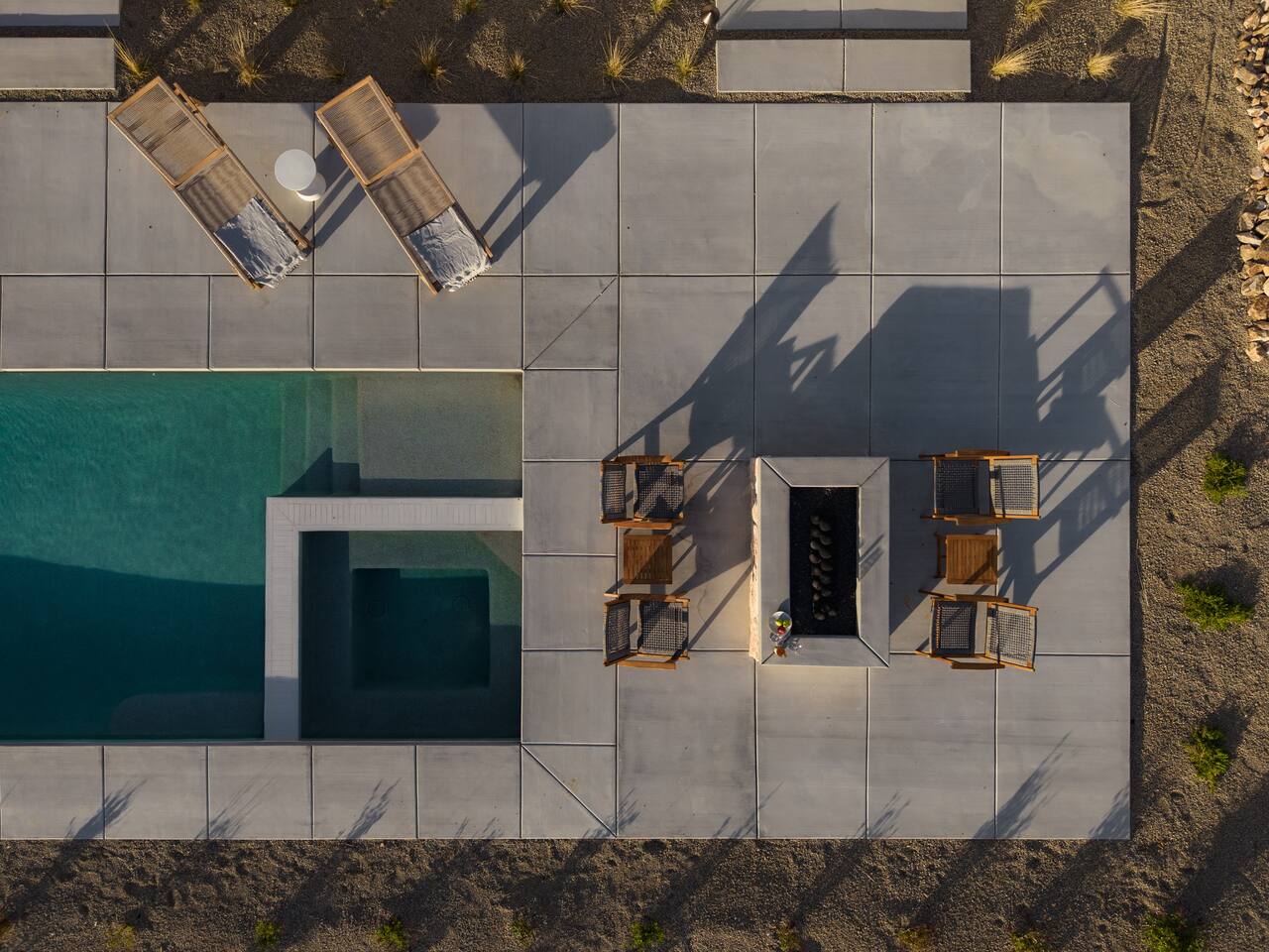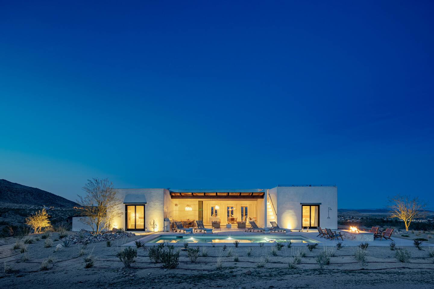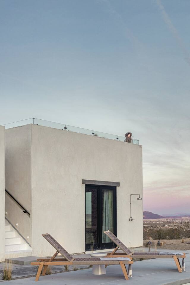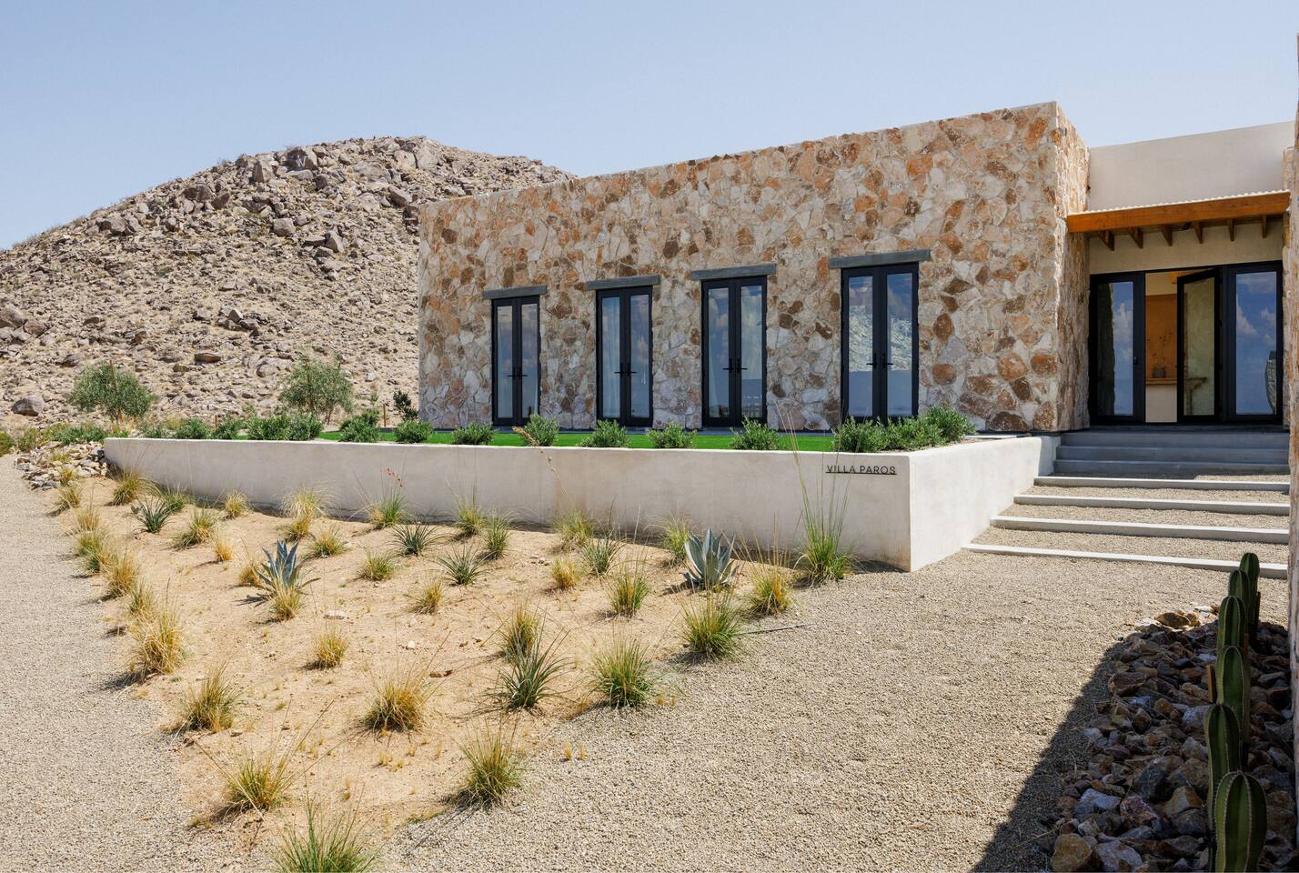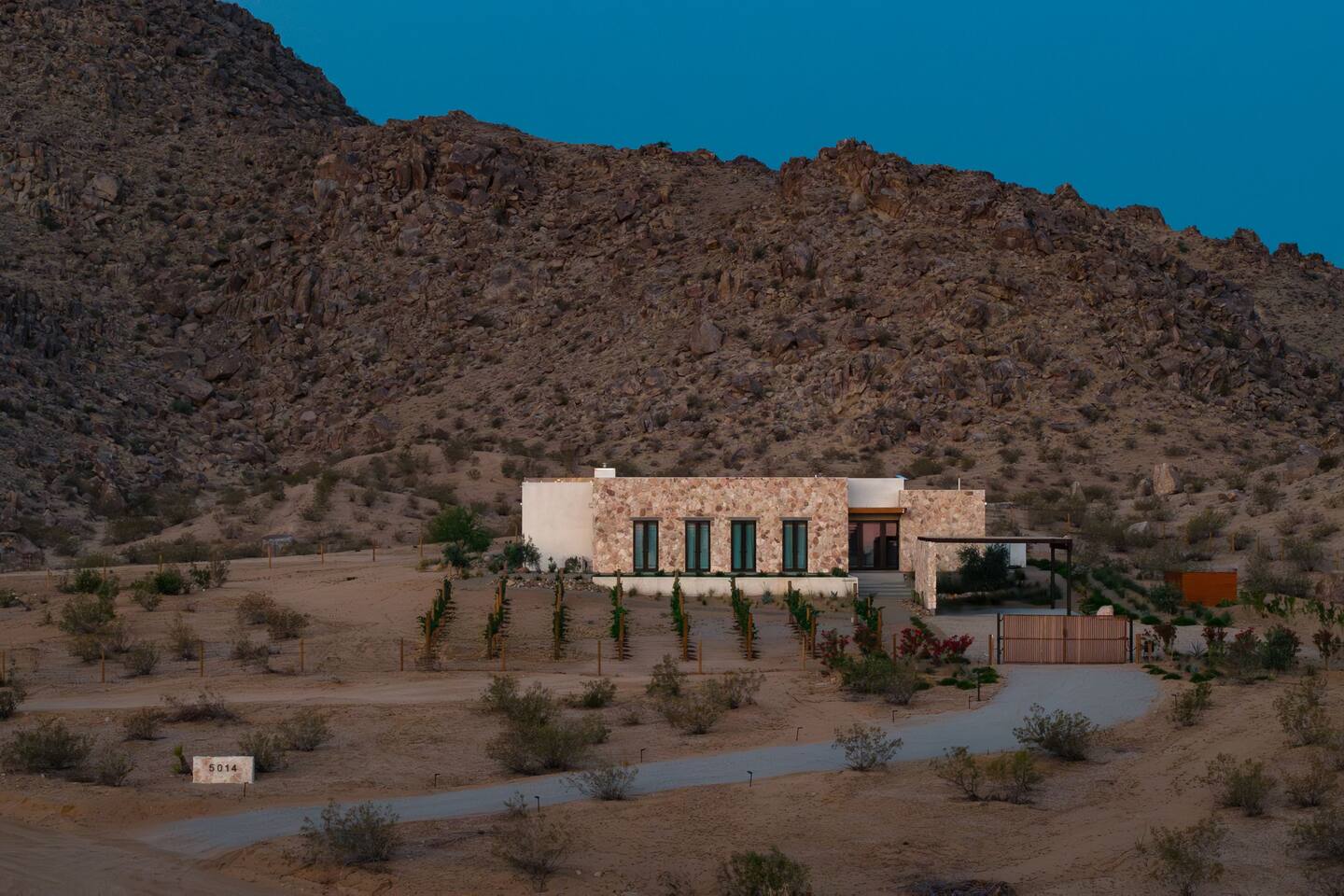 Villa Paros is your private 3-acre escape where Mediterranean ease meets high desert beauty. This thoughtfully designed 3-bedroom villa is rooted in the landscape, surrounded by native flora, sculpted with architectural simplicity, and infused with indoor-outdoor flow. Step into the calm: • Heated pool and spa framed by mountain views • Yoga lawn overlooking our private vineyard • Rooftop and poolside fire pits for golden hour rituals • Working vineyard with four Mediterranean varietals, harvested each September for wine • Direct access to scenic Bartlett Mountains hiking trails just behind the property • Outdoor dining, gas grill, and star-studded nights • EV charger Each bedroom is tailored for rest, with plush bedding, TVs, and high-speed WiFi. The entire property is gated and fully fenced for peace of mind and total privacy. Whether you're lounging poolside, exploring nearby trails, or gathering around the fire, Villa Paros offers a stay that’s both grounding and elevated. Experiences: Rooted in the community, we know the desert well and enjoy sharing it with our guests. Here are some unforgettable ways to experience the area. - Immerse yourself in a sound bath at the Integratron or with a local practitioner. - Book an in-home massage with a trusted desert therapist. - Set out on a private guided hike. - Enjoy a custom meal prepared in-home by a private chef. - Move and reset with a personal Yoga or Pilates session. - Discover the night sky on a private stargazing tour under some of California’s darkest skies. - Explore canyons and creeks on a private horseback ride. - Cold plunges and wellness sessions with local experts. We’d love to connect you with our favorite local guides and practitioners.