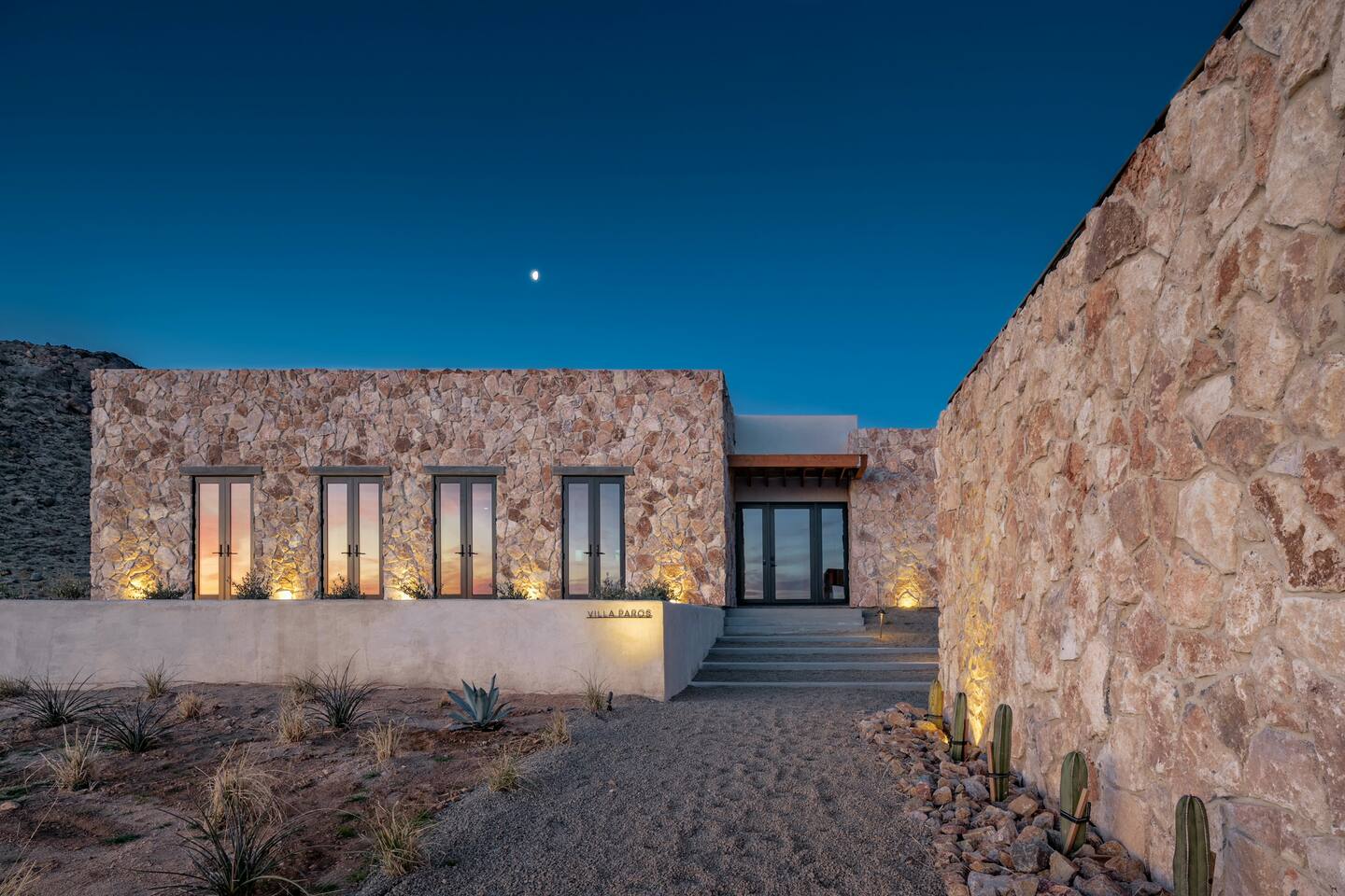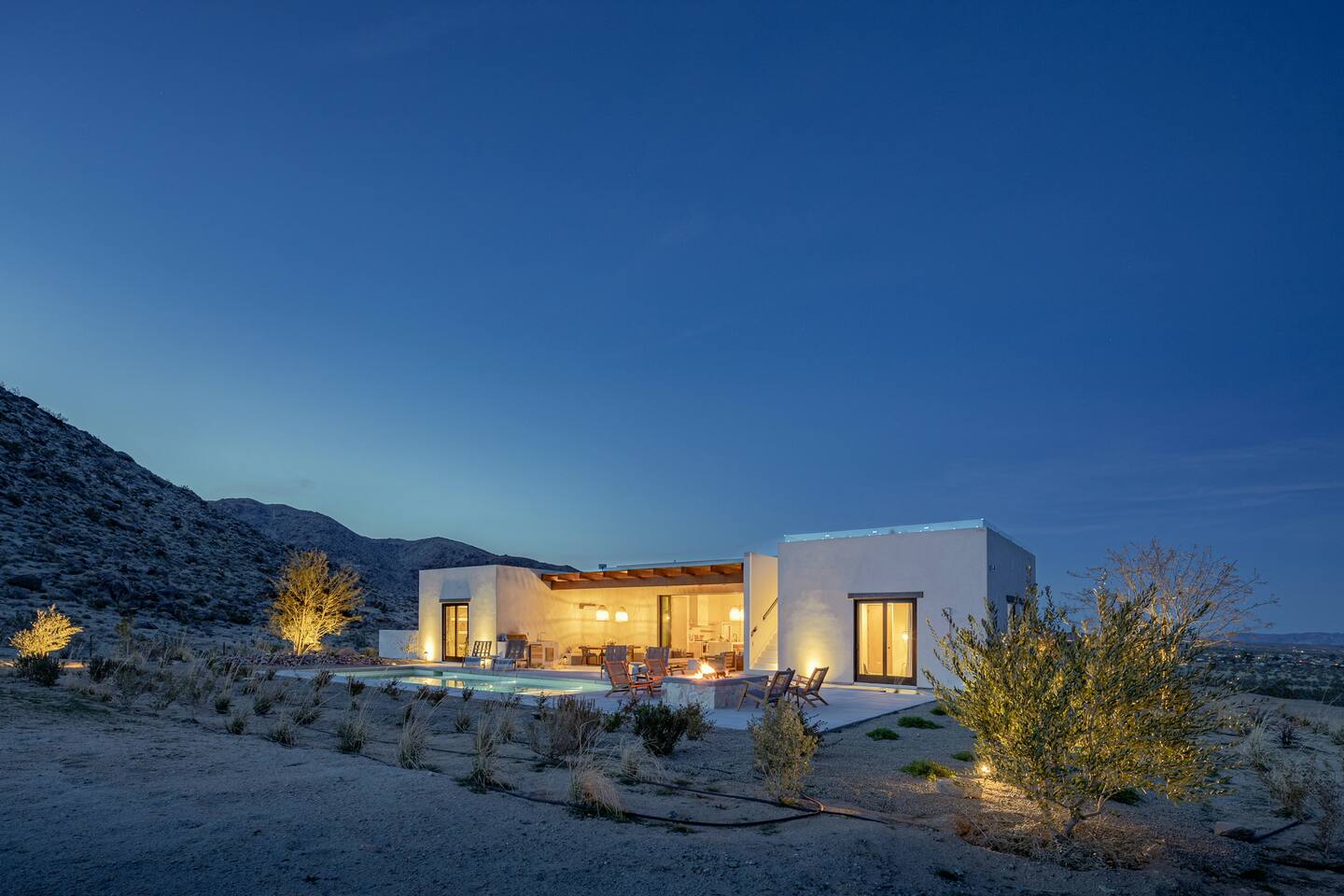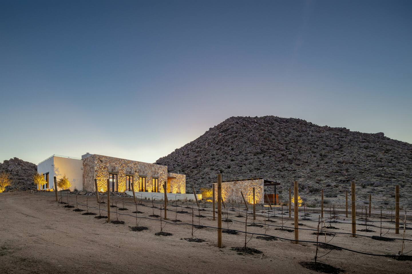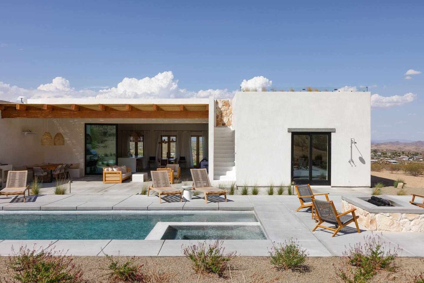 Villa Paros is your private 3-acre escape where Mediterranean ease meets high desert beauty. This thoughtfully designed 3-bedroom villa is rooted in the landscape, surrounded by native flora, sculpted with architectural simplicity, and infused with indoor-outdoor flow. Step into the calm: • Heated pool and spa framed by mountain views • Yoga lawn overlooking our private vineyard • Rooftop and poolside fire pits for golden hour rituals • Working vineyard with four Mediterranean varietals, harvested each September for wine • Direct access to scenic Bartlett Mountains hiking trails just behind the property • Outdoor dining, gas grill, and star-studded nights • EV charger Each bedroom is tailored for rest, with plush bedding, TVs, and high-speed WiFi. The entire property is gated and fully fenced for peace of mind and total privacy. Whether you're lounging poolside, exploring nearby trails, or gathering around the fire, Villa Paros offers a stay that’s both grounding and elevated. Experiences: Rooted in the community, we know the desert well and enjoy sharing it with our guests. Here are some unforgettable ways to experience the area. - Immerse yourself in a sound bath at the Integratron or with a local practitioner. - Book an in-home massage with a trusted desert therapist. - Set out on a private guided hike. - Enjoy a custom meal prepared in-home by a private chef. - Move and reset with a personal Yoga or Pilates session. - Discover the night sky on a private stargazing tour under some of California’s darkest skies. - Explore canyons and creeks on a private horseback ride. - Cold plunges and wellness sessions with local experts. We’d love to connect you with our favorite local guides and practitioners.