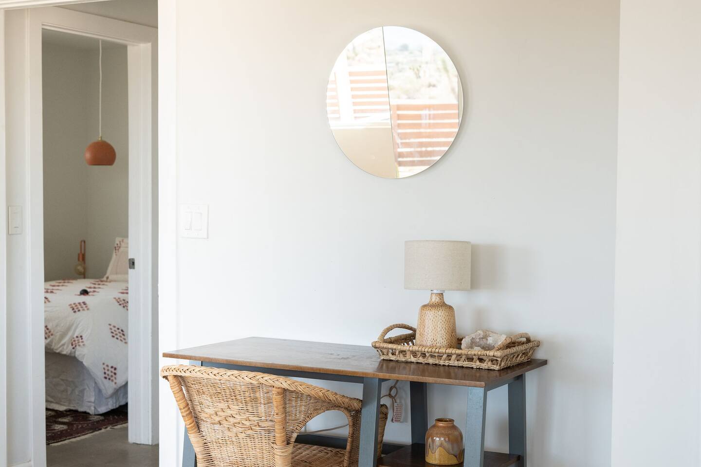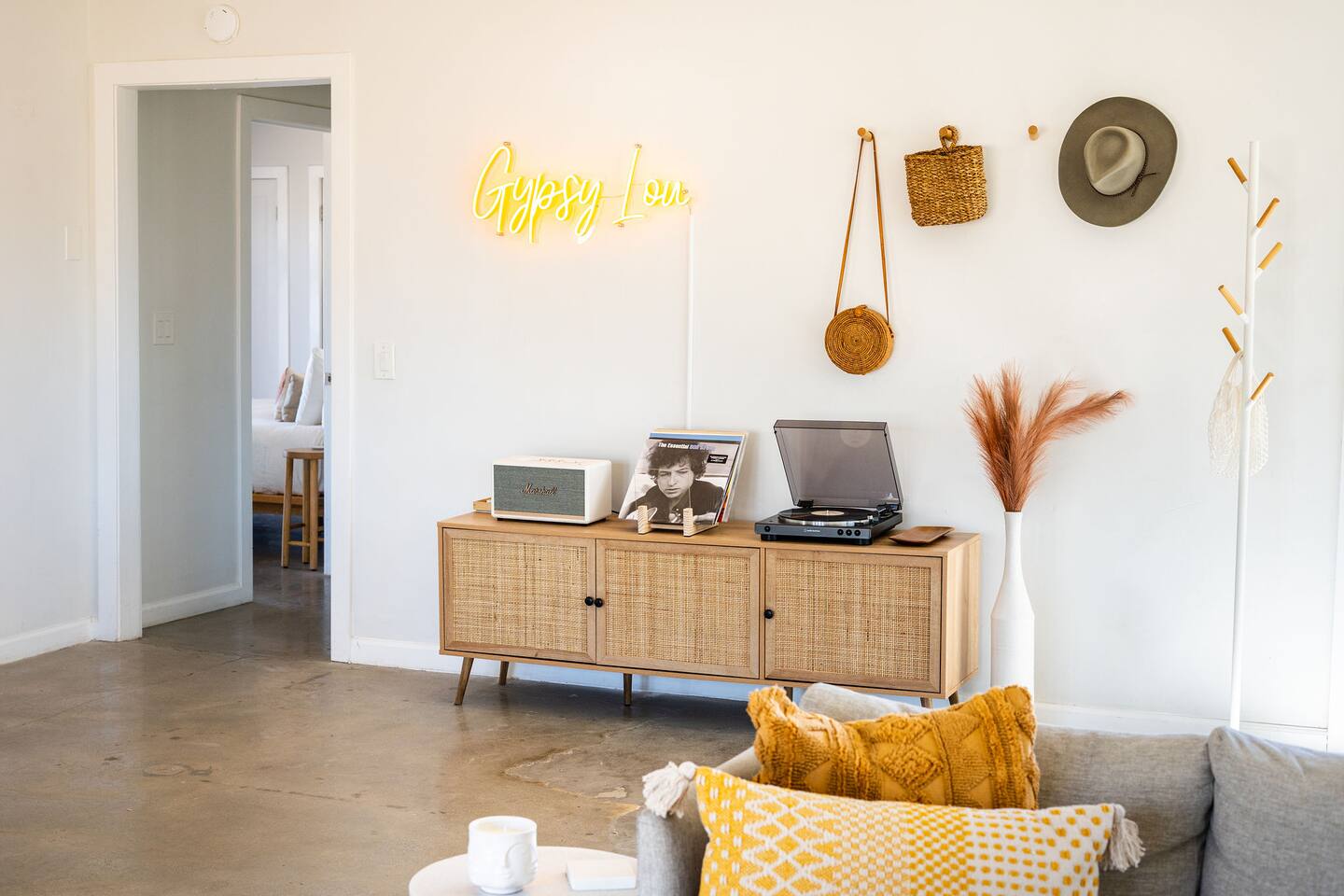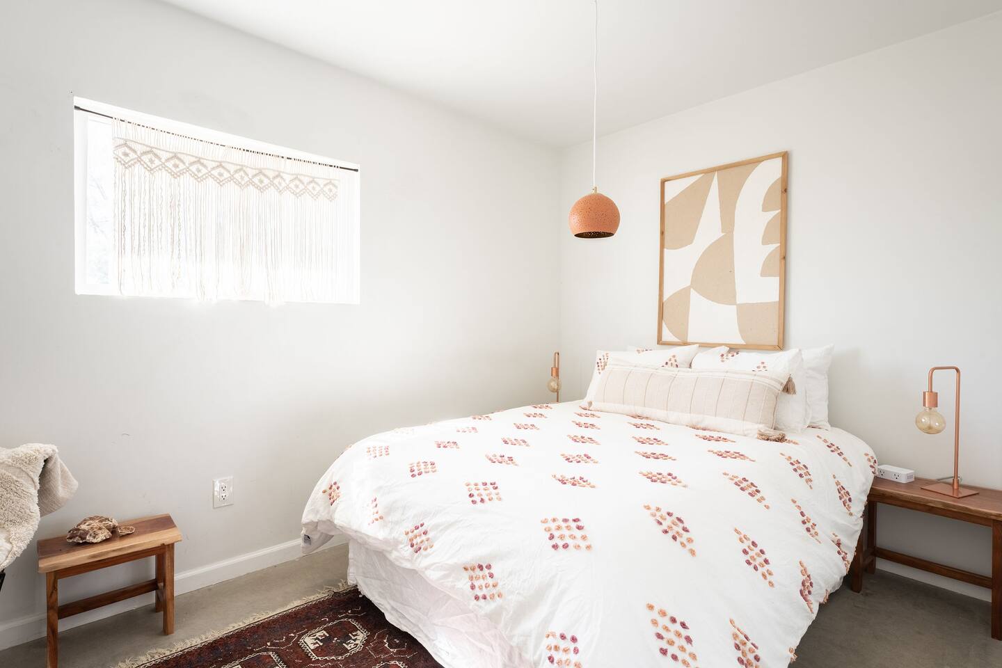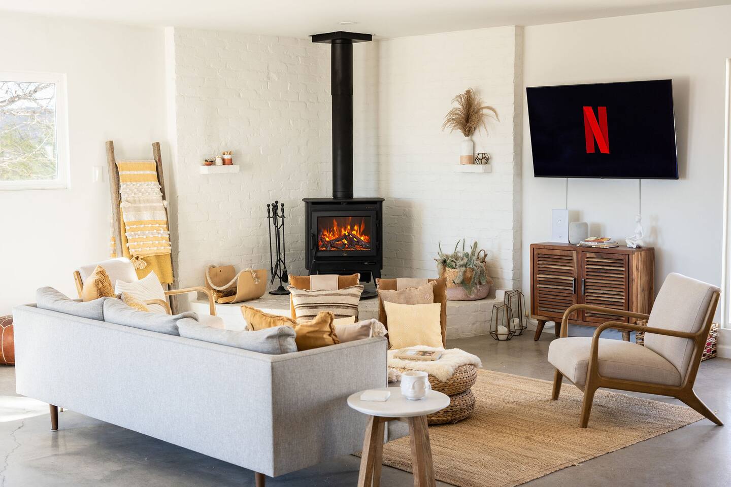 Welcome to Gypsy Lou! Enjoy a cozy indoor fireplace, 3 bedrooms, 2 bathrooms with outdoor lounging chairs, cowboy pool and hot tub! Each room has been thoughtfully decorated with small details that add to the overall charm & character of the space. Relax in the luxurious indoor tub soaking in the warm water, overlooking the stunning desert views outside, and feeling completely relaxed & rejuvenated, whether you're looking to barbecue with friends or simply relax in the hot tub under the stars.