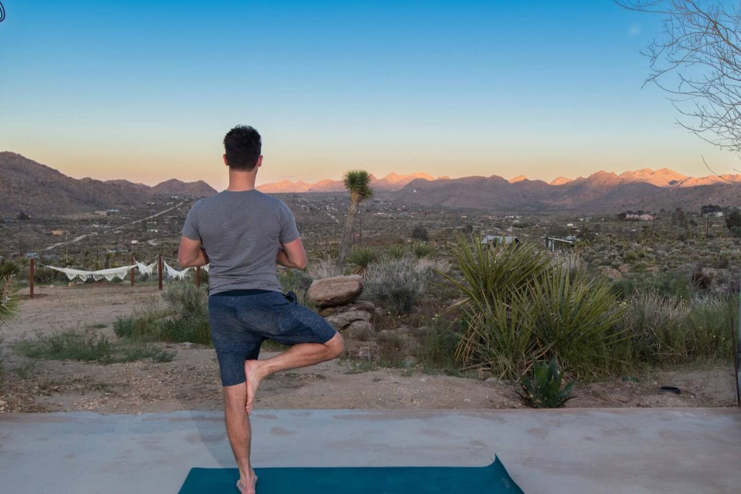 A rustic and well-loved desert retreat with wide-open views and a peaceful spirit. The Sunrise Suite is a private two-bedroom space in a shared home on five acres, with your own hot tub and access to a pool, firepit, and shared kitchen. Designed for travelers who appreciate quiet beauty, simple comforts, and the timeless calm of the high desert. Just 8 minutes from the park gate and also just 8 minutes to downtown JT with shops, coffee and restaurants.